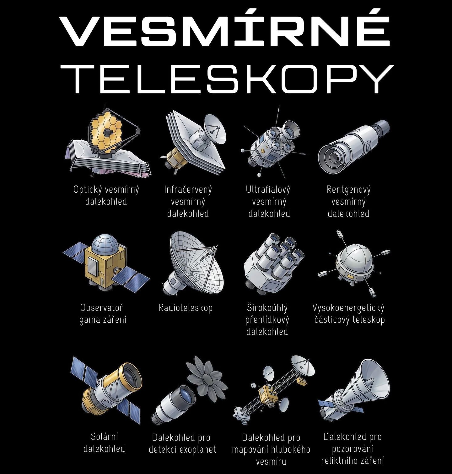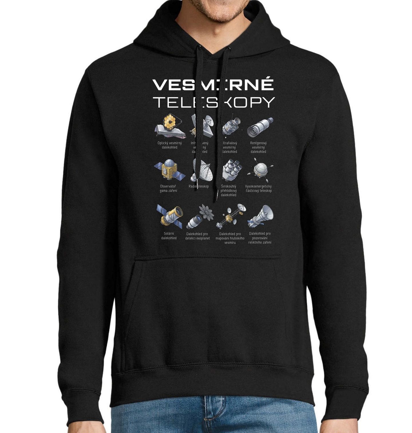 Pánská mikina Vesmírné Teleskopy. Na motivu najdeš přehled různých teleskopů: Optický vesmírný dalekohled, Infračervený dalekohled, Ultrafialový dalekohled, Rentgenový dalekohled, Gama observatoř, Radioteleskop, Širokoúhlý přehlídkový dalekohled, Vysokoenergetický teleskop, Solární dalekohled, Dalekohled pro detekci exoplanet, Dalekohled pro mapování hlubokého vesmíru a Dalekohled pro reliktní záření.