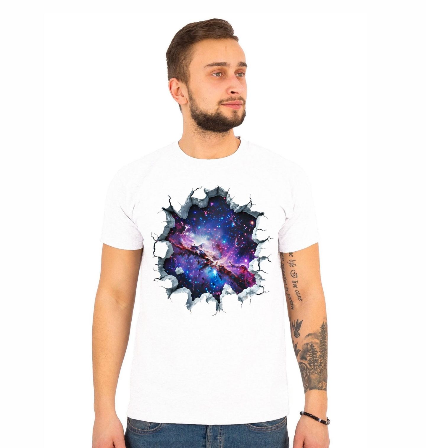 Pánské tričko Vesmírný Portál 3D. Unikátní motiv s výrazným efektem průlomu, který odhaluje fascinující vesmír plný barev, hvězd a galaxií. Tento vizuální efekt vytváří iluzi, jako by se před tebou otevřel portál do nekonečného prostoru plného energie a tajemství. Detailní zpracování vesmíru v kombinaci s realistickým prasklým okrajem dodává motivu hloubku a dynamiku.