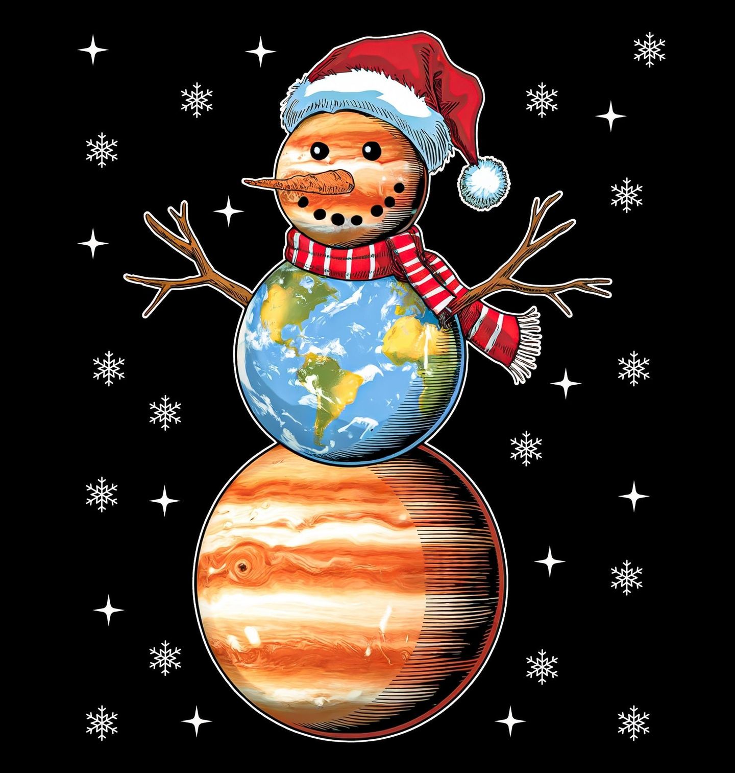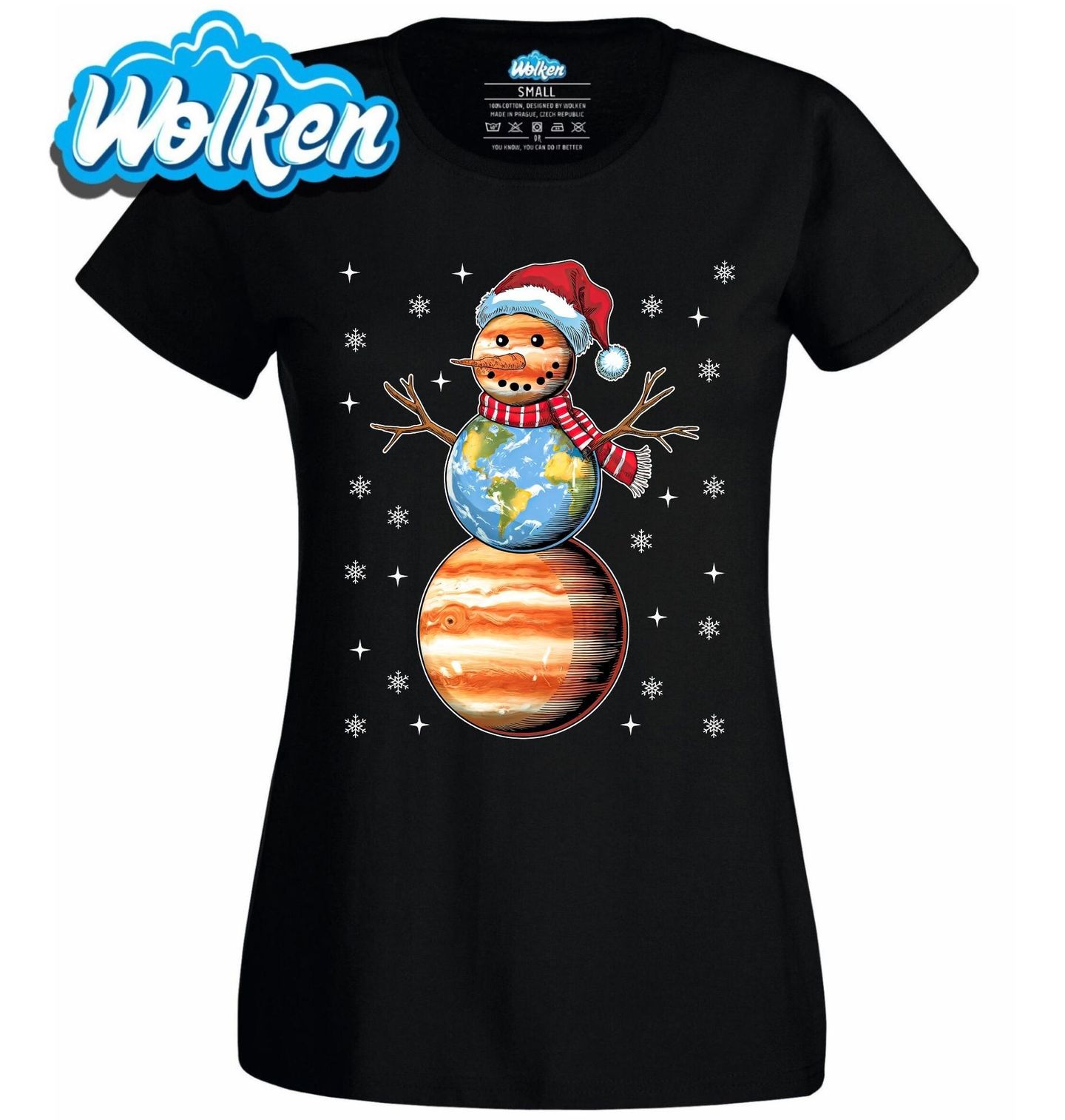 Dámské tričko Vesmírný Sněhulák. Přivítejte Vánoce s opravdu netradičním motivem, kde se sněhulák zrodil přímo ve vesmíru! Tento originální design spojuje Vánoce, vesmír, sněhulák a planety Země a Jupiter do jednoho hravého a stylového celku, který si zamilují milovníci astronomie i zimní pohody.