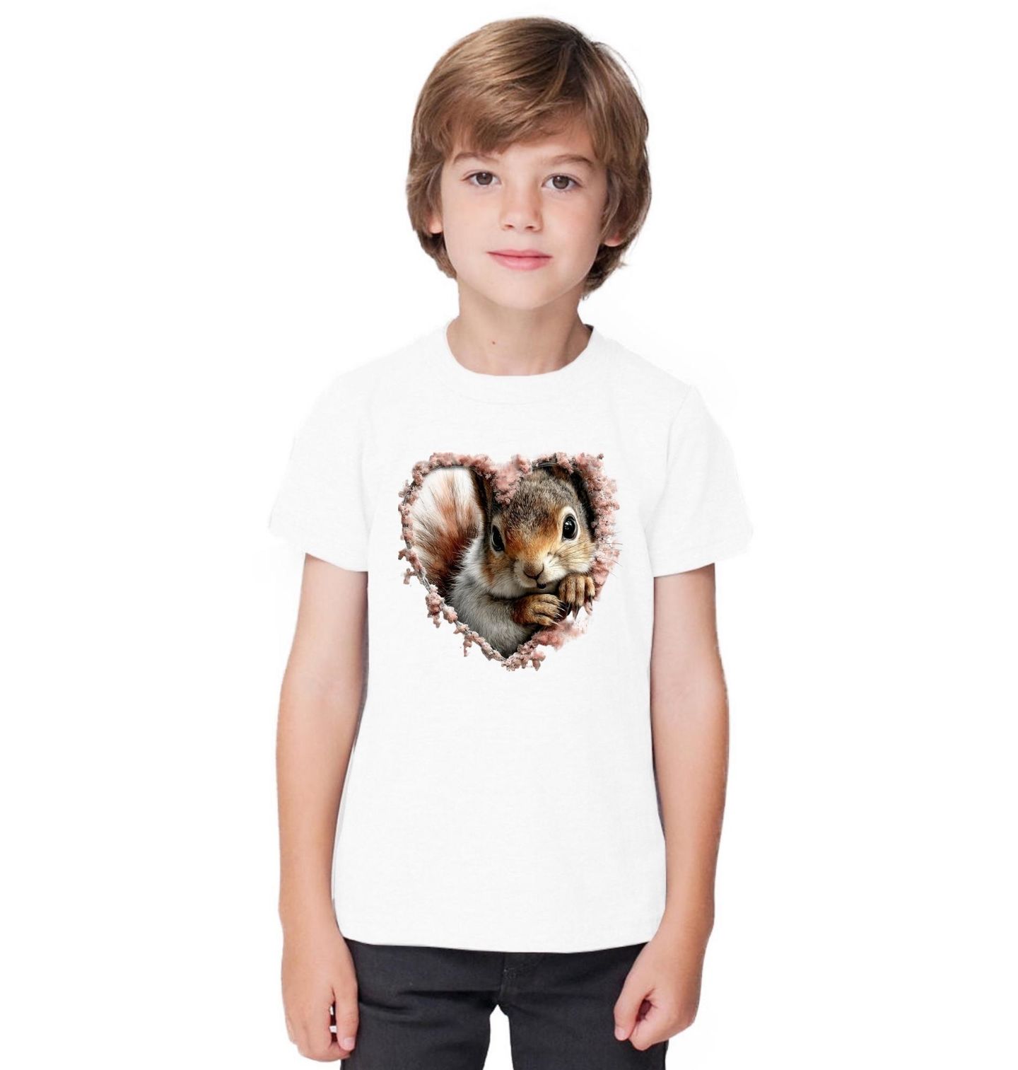 Dětské tričko Veverka v Srdci. Něžný a detailní motiv, kde veverka vykukuje ze tvaru srdce, okamžitě upoutá pozornost svou roztomilostí a přirozenou krásou. Realistické zpracování srsti v kombinaci s jemným srdcovým rámem vytváří harmonický design plný emocí, něhy a lásky k přírodě.