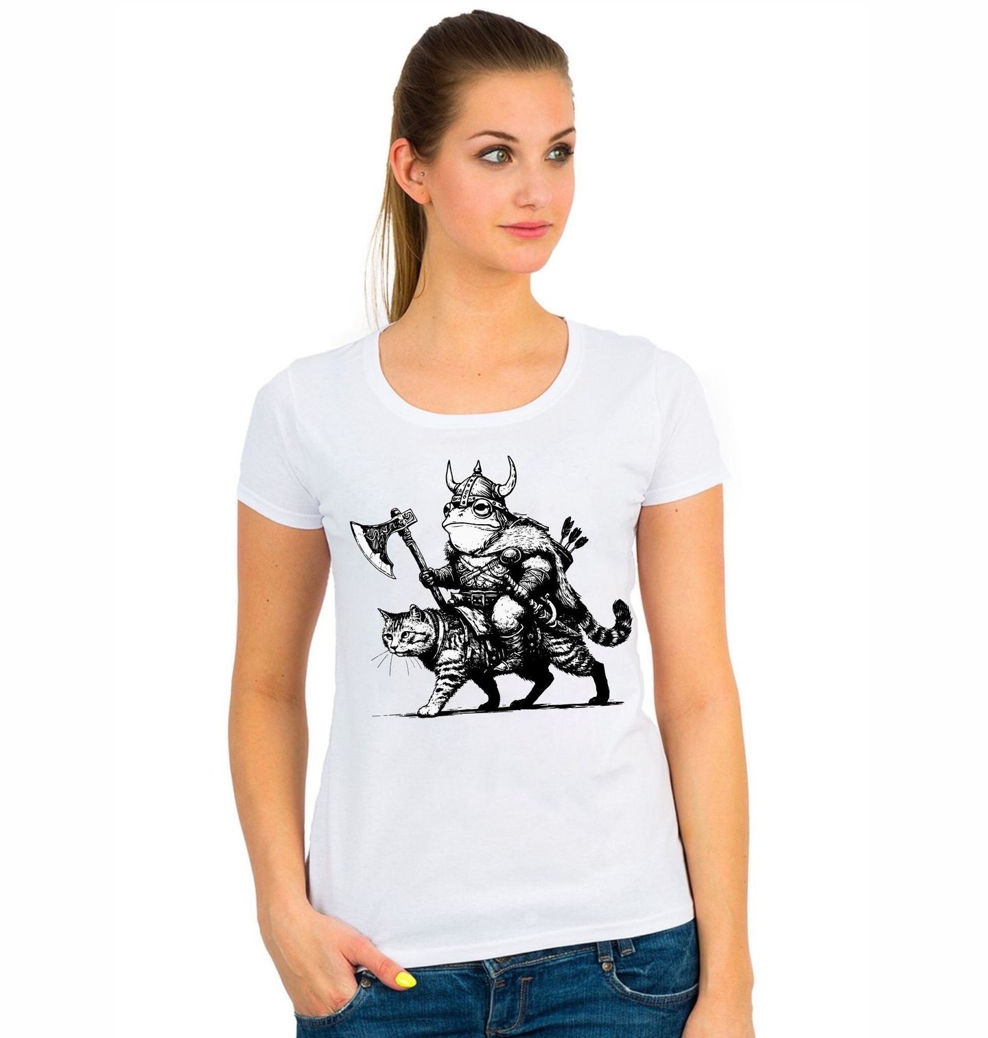 Dámské tričko Vikingská Žába na Kočce. Unikátní motiv „žába na kočce“ přináší originální spojení fantasy světa a severské estetiky. Ilustrace zachycuje neohroženého válečníka, kterým je žába v roli vikingského bojovníka, jedoucího na svém věrném společníkovi – tím je kočka. Výrazná zbroj, sekera a detaily výstroje dodávají celému motivu epický a drsný charakter.