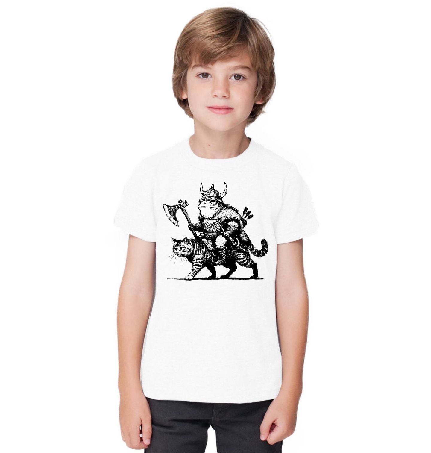 Dětské tričko Vikingská Žába na Kočce. Unikátní motiv „žába na kočce“ přináší originální spojení fantasy světa a severské estetiky. Ilustrace zachycuje neohroženého válečníka, kterým je žába v roli vikingského bojovníka, jedoucího na svém věrném společníkovi – tím je kočka. Výrazná zbroj, sekera a detaily výstroje dodávají celému motivu epický a drsný charakter.