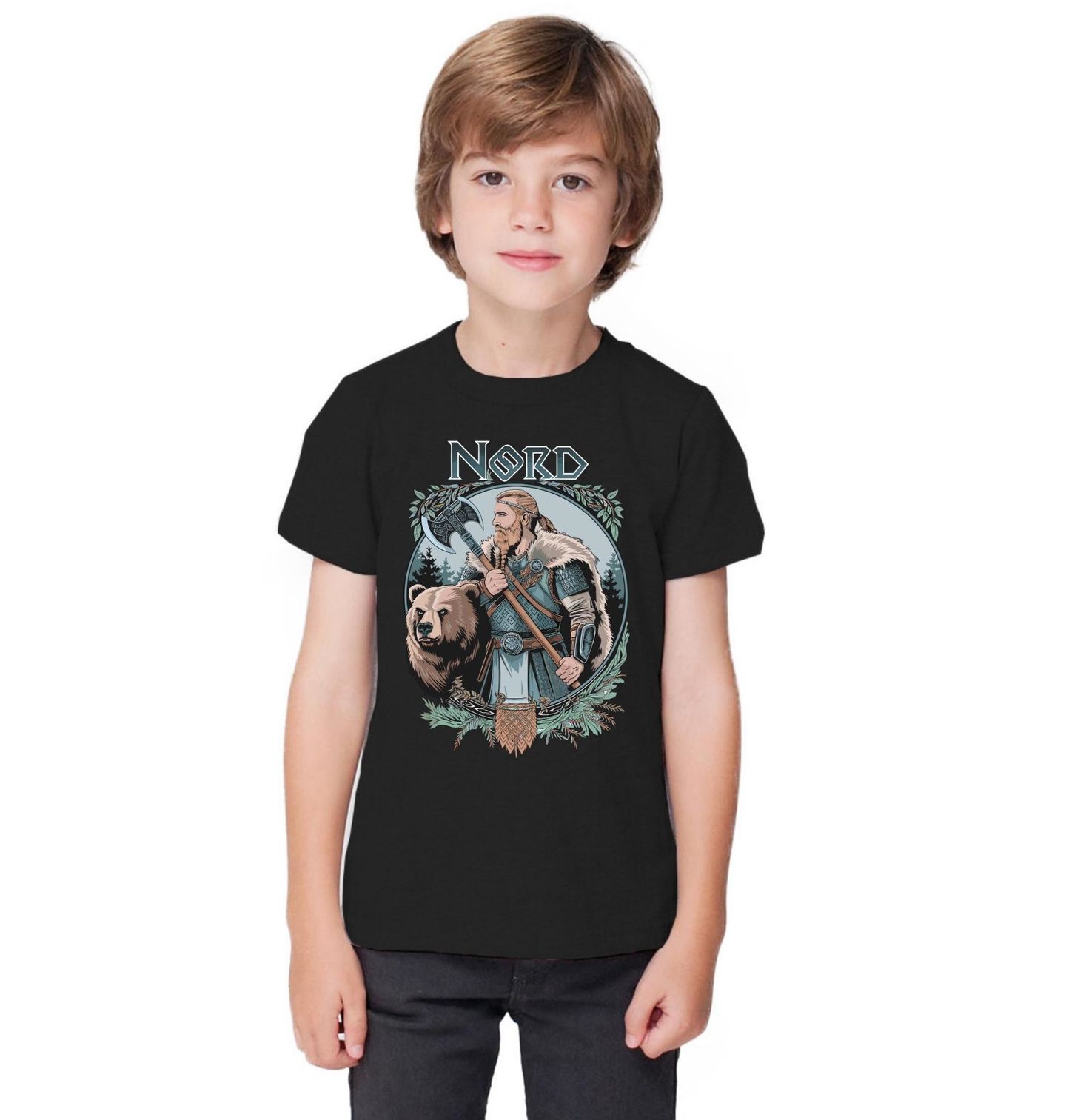 Dětské tričko Vikingský Bojovník s Mědvědem NORD. Hrdinský severský motiv zobrazuje válečníka severu po boku mocného zvířete, jakým je medvěd – symbol surové síly, odvahy a ochrany. Viking držící sekeru stojí v lesní krajině, zatímco medvěd představuje jeho duchovního průvodce a ochránce v boji i na cestě životem.