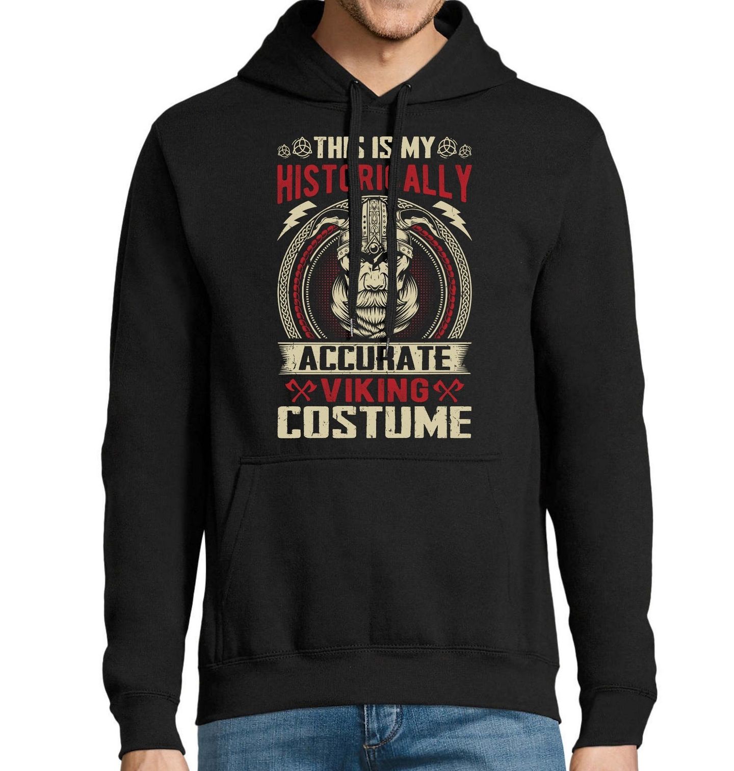 Pánská mikina Vikingský Kostým. Tento výrazný design zobrazuje drsného vikingského bojovníka a text „This is my historically accurate Viking costume“, což v překladu znamená „Tohle je můj historicky přesný vikingský kostým“. Ideální pro fanoušky severské mytologie a humoru, kteří chtějí originální design s nadsázkou.