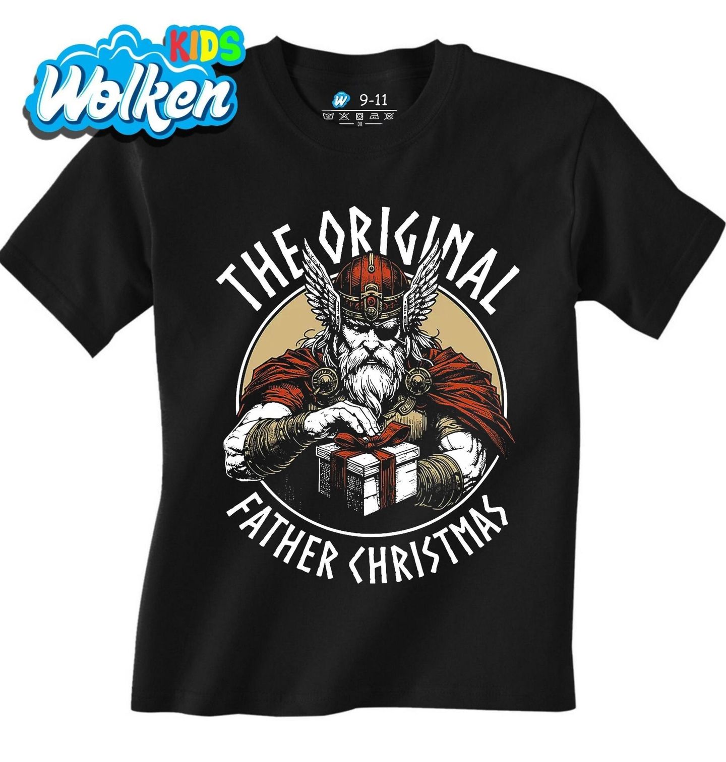 Dětské tričko Vikingský Otec Vánoc. Objevte netradiční pohled na Vánoce s tímto originálním motivem „The Original Father Christmas“ = Původní Otec Vánoc. Je zde vousatý válečník s helmou s křídly (inspirovaný vikingskou nebo severskou mytologií), v červeném plášti, držící dárkovou krabici s mašlí.