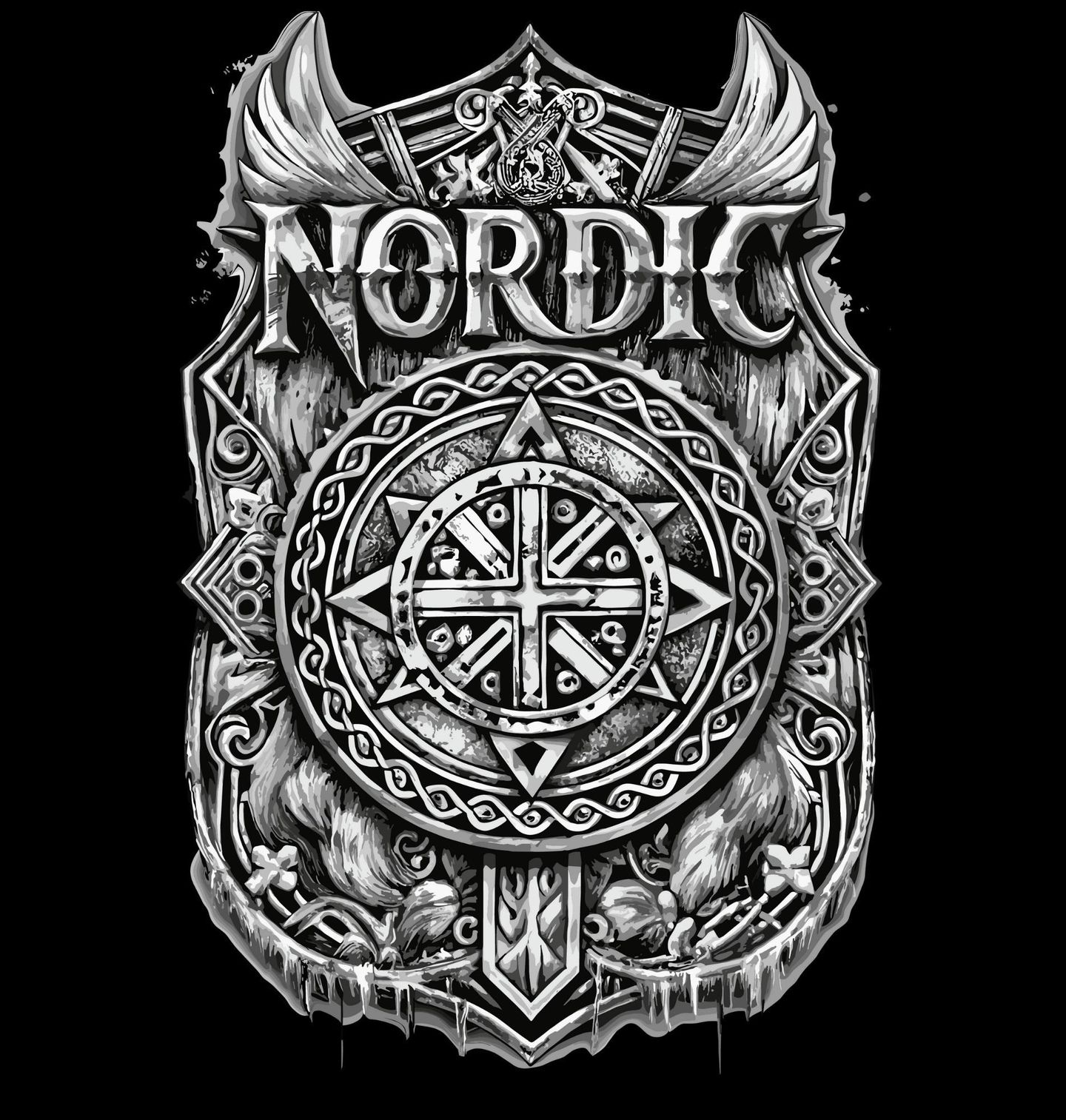 Pánské tričko Vikingský Štít Nordic. Dominantní severský motiv inspirovaný mytologií a válečnou kulturou severu zobrazuje Viking štít s tradičním nordickým symbolem. Tento design představuje sílu, čest a nezdolnost, které byly vlastní každému bojovníkovi. Precizní ornamenty, drsný kovový vzhled a historická symbolika vytvářejí výrazný motiv pro fanoušky severské kultury, mytologie a válečné estetiky.