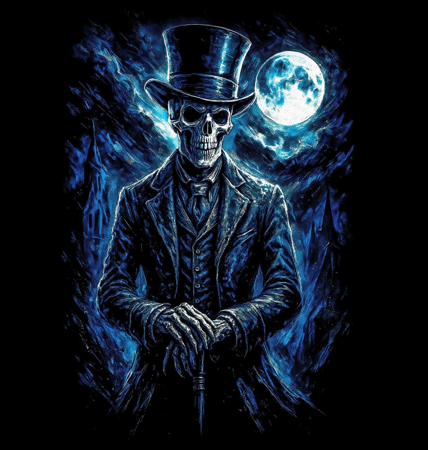 Dětské tričko Viktoriánský Kostlivec pod Měsícem. Stylový motiv, kde kostlivec v elegantním viktoriánském kostýmu stojí pod tajemným měsícem. Kombinace aristokratického vzhledu, temné atmosféry a nočního světla vytváří výrazný design plný mystiky, elegance a síly. Ideální pro milovníky gothic stylu, historie i moderní temné estetiky.