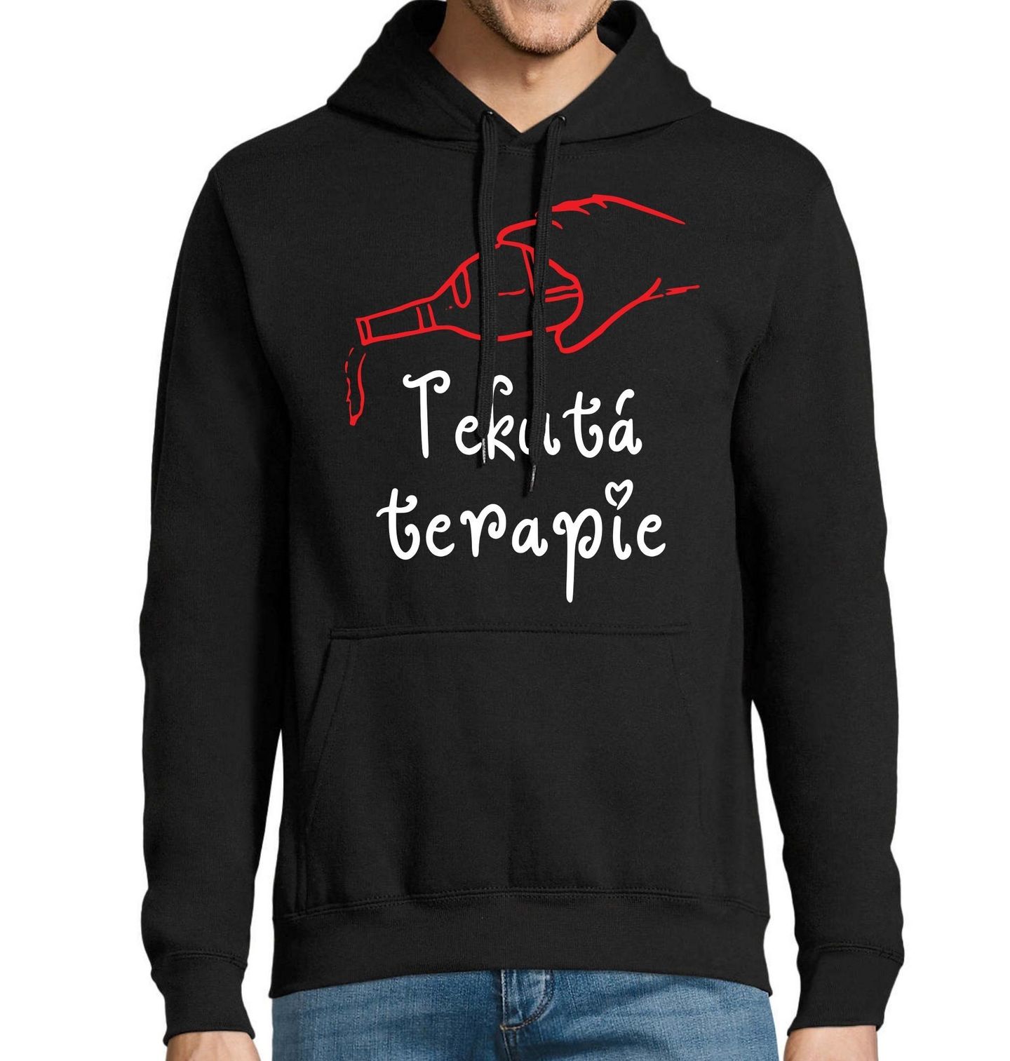 Pánská mikina Víno Tekutá terapie. Originální design s humorným nápisem „Tekutá terapie“ potěší každého, kdo bere život s nadhledem a ví, že občasné víno nebo pivo dokáže zlepšit náladu. Motiv je jako stvořený pro všechny, kdo mají rádi pohodu, alkohol a uvolněnou párty atmosféru s přáteli.