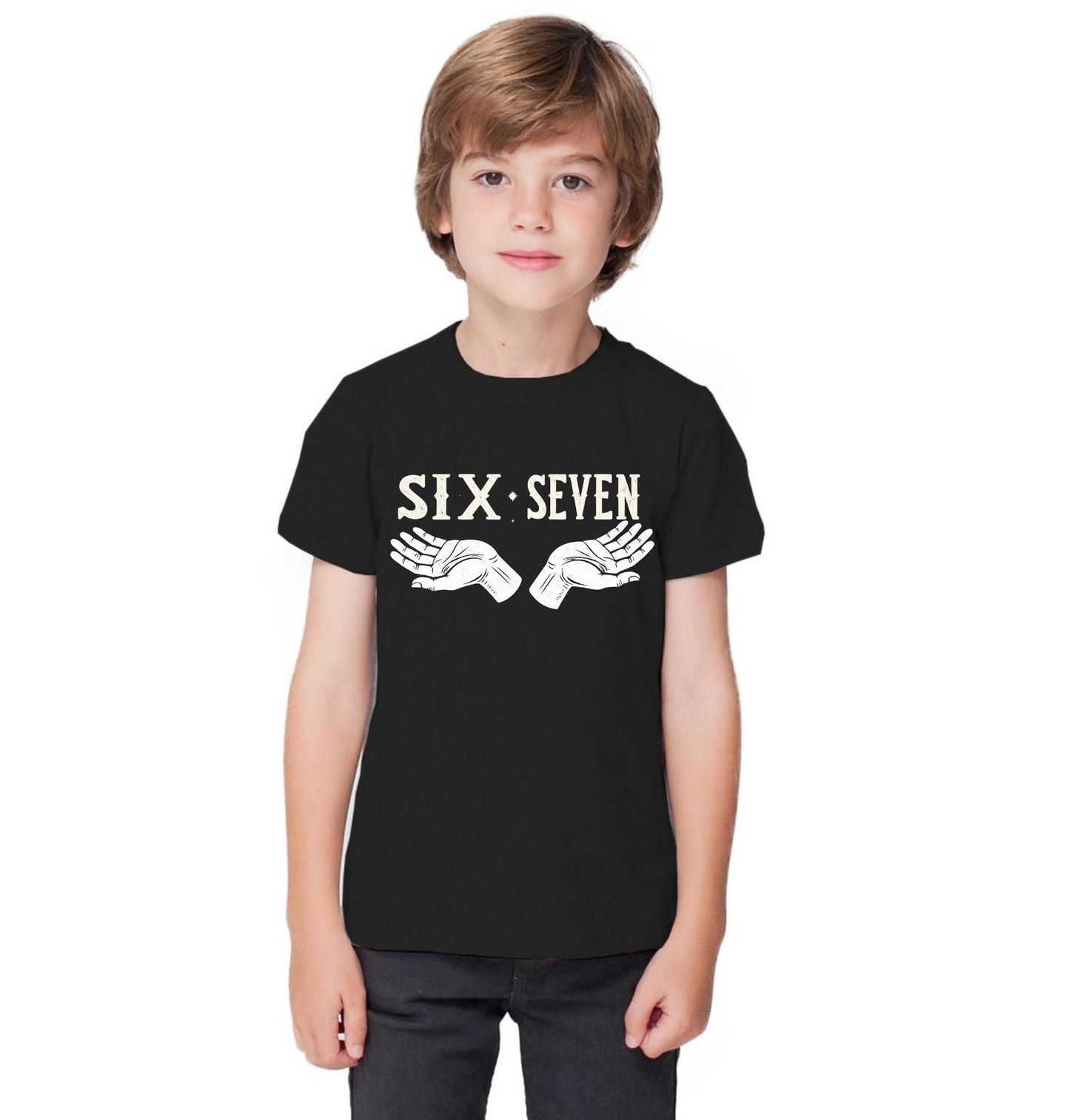 Dětské tričko Vintage 67 na Dlaních Six Seven. Stylový minimalistický design 67 s nápisem six seven a grafikou dvou otevřených rukou, který působí jako originální a lehce ironický meme motiv. Perfektní pro všechny, kdo milují jednoduchý, ale výrazný humor – bez zbytečných ozdob, jen čistá retro grafika a vtipná symbolika.