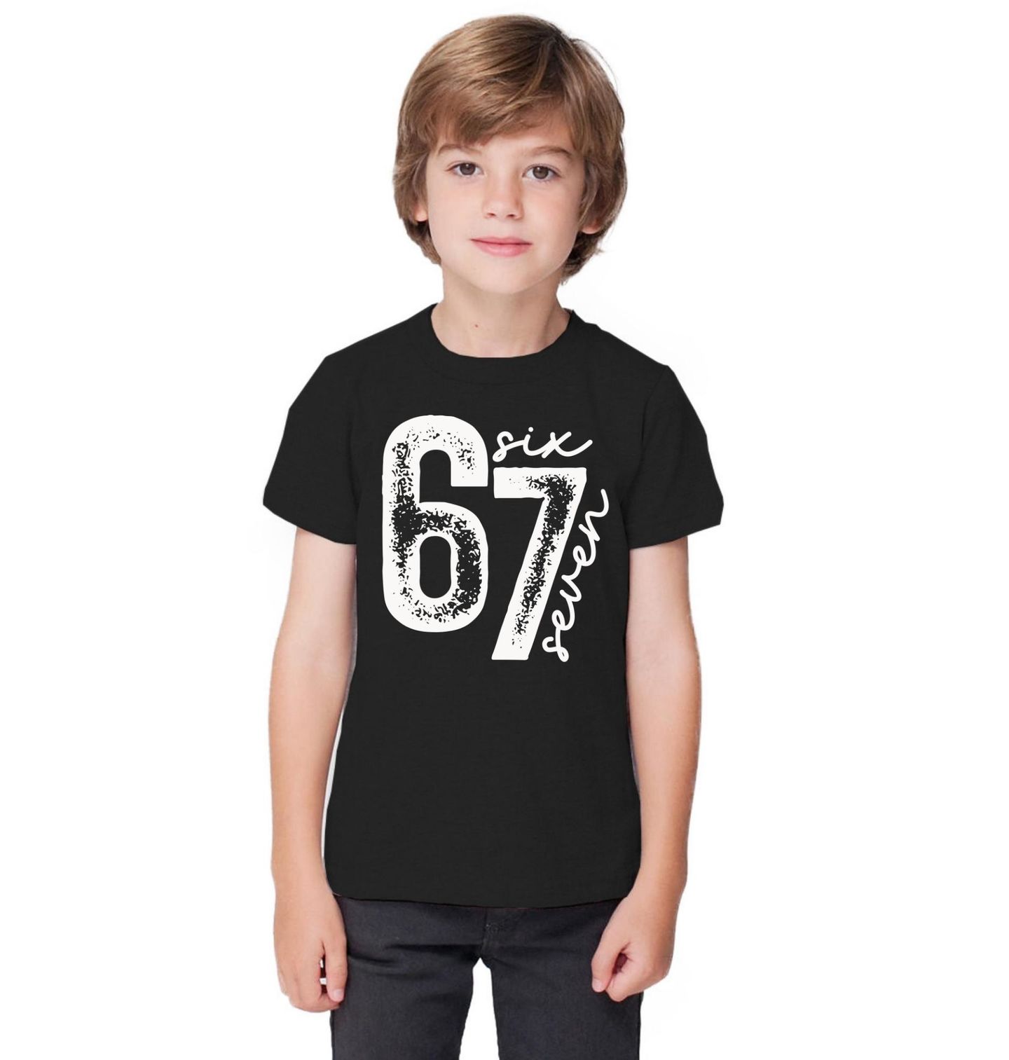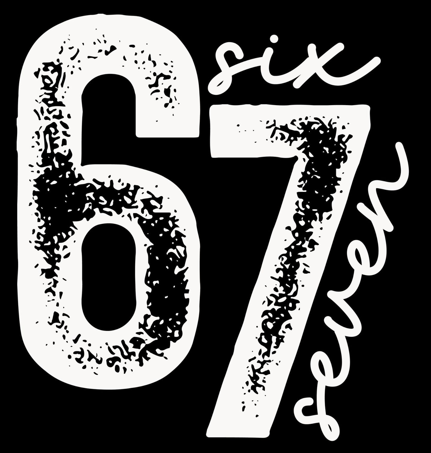 Dětské tričko Vintage 67 Six Seven Meme. Motiv tvoří výrazné číslo 67 v lehce „opotřebovaném“ vintage stylu. Kolem čísla je ručně psaný nápis six seven, který dodává designu moderní a hravou atmosféru. Minimalistický černobílý vzhled působí stylově a zároveň lehce ironicky — přesně tak, jak to má dobré meme.
