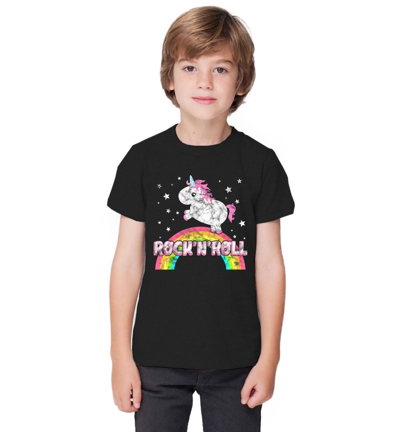 Dětské tričko Vintage Jednorožec na Duze Rock’n’Roll. Roztomilý a hravý motiv spojuje kouzelný svět fantazie s energií Rock and Roll. Hlavní postavou je veselý jednorožec s růžovou hřívou, který poskakuje po barevné duze pod hvězdnou oblohou. Design působí jemně vintage díky lehce „oprýskanému“ efektu a je ideální pro všechny milovníky hudby, pohádek a pozitivní nálady.