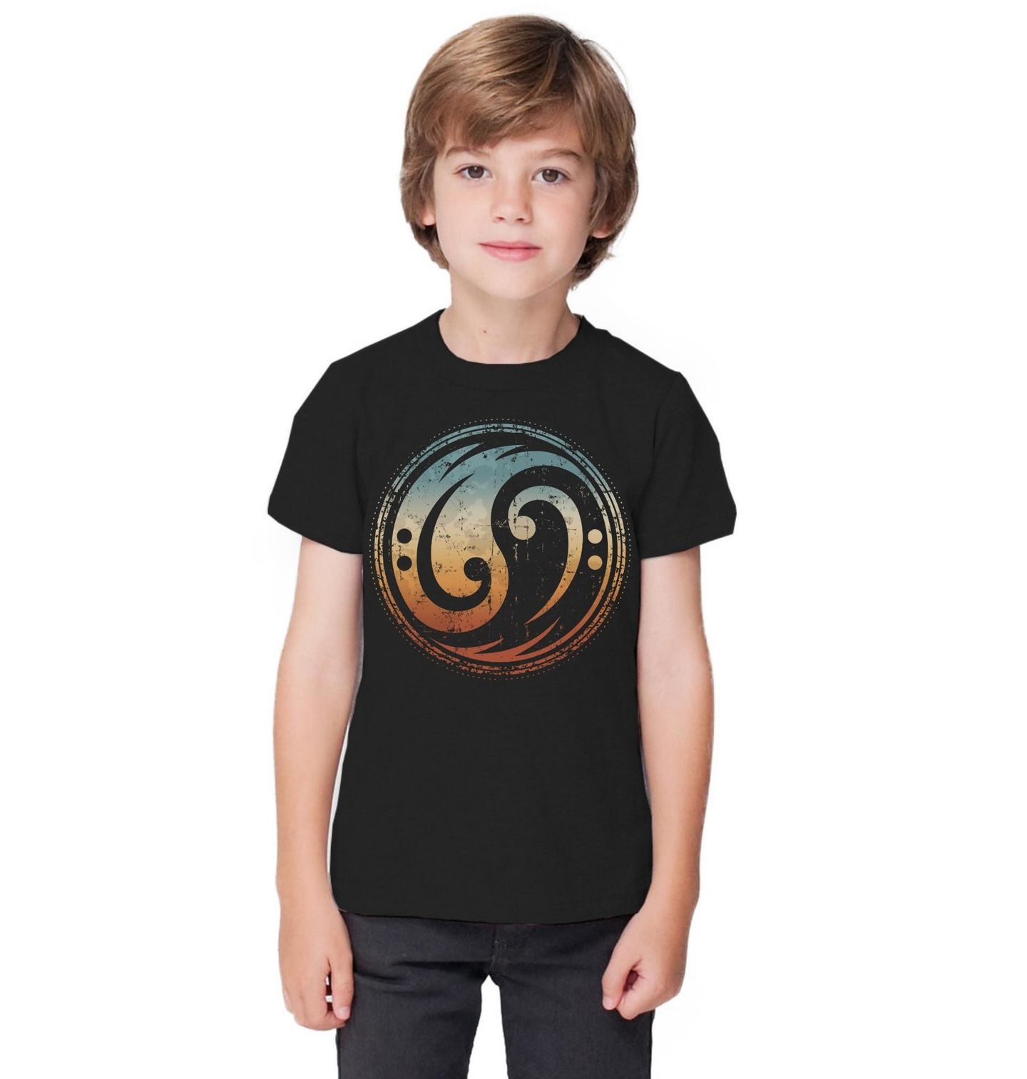 Dětské tričko Vintage Jin a Jang Basový Klíč. Basový Klíč představuje hluboké tóny, základ harmonie a rytmickou stabilitu. Právě Baskytara je nástroj, který drží groove kapely pohromadě a vytváří pevný hudební základ. Stejně jako jin a jang symbolizuje rovnováhu mezi protiklady – světlem a tmou, klidem a energií, tichem a zvukem.