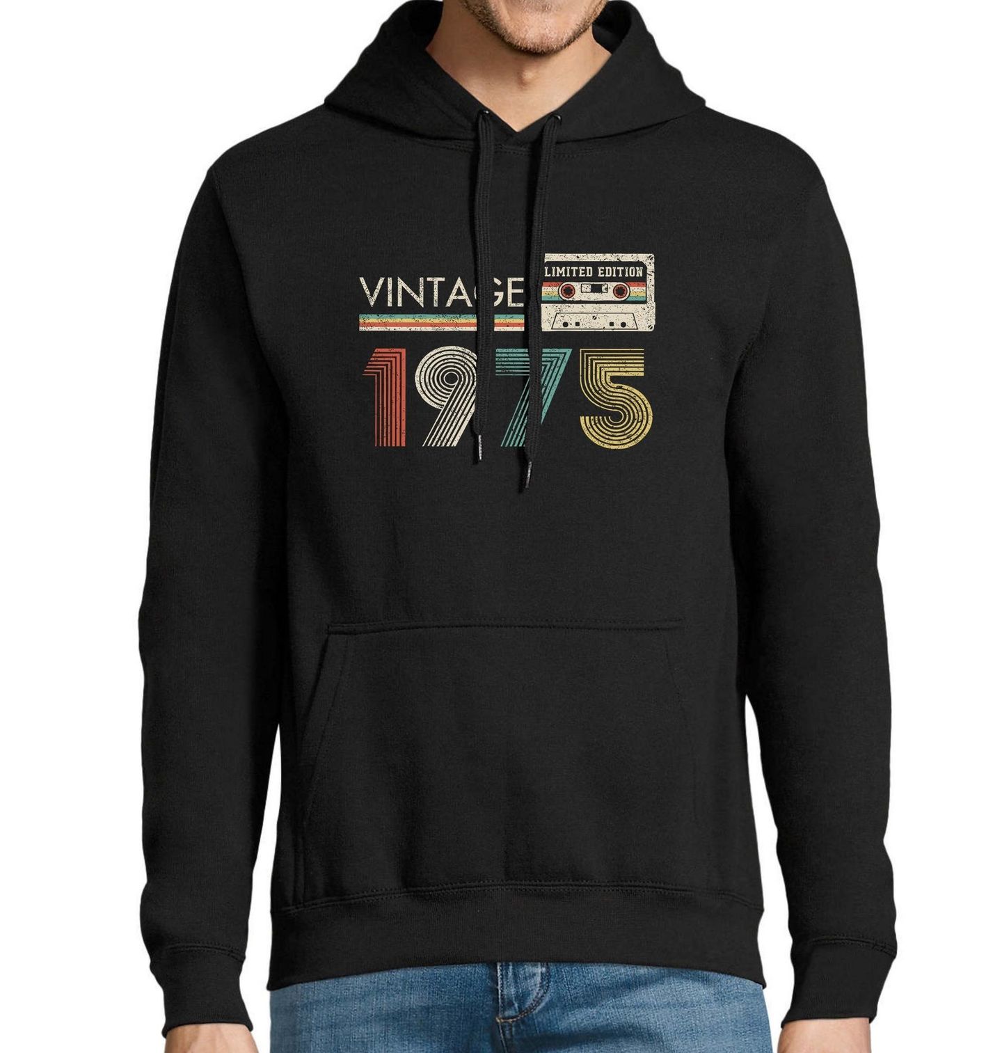 Pánská mikina Vintage Kazeta 1975. Vrať se do zlaté éry stylu s tímto originálním tričkem Retro klenot 1975! Vintage design s kazetou a výrazným letopočtem připomíná atmosféru sedmdesátek – éru hudby, módy a svobody. Pokud jsi byl/a vyroben/a v roce 1975, tohle tričko je limitovaná edice stejně jako ty.