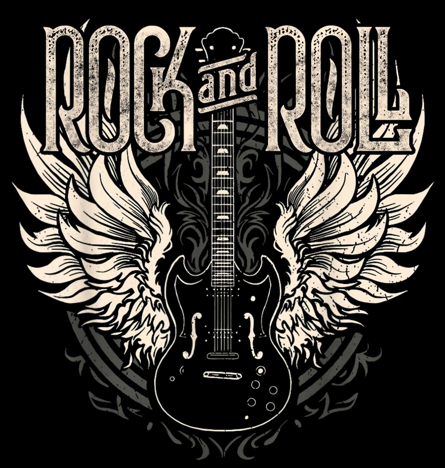 Pánské tričko Vintage Kytara s Křídly Rock and Roll. Stylový motiv s výrazným nápisem Rock and Roll doplňuje detailně zpracovaná elektrická kytara s roztaženými křídly. Kombinace vintage typografie, jemné patiny a kontrastního černobílého provedení vytváří nadčasový design, který dokonale vystihuje energii, sílu a svobodu, kterou přináší rock and roll.
