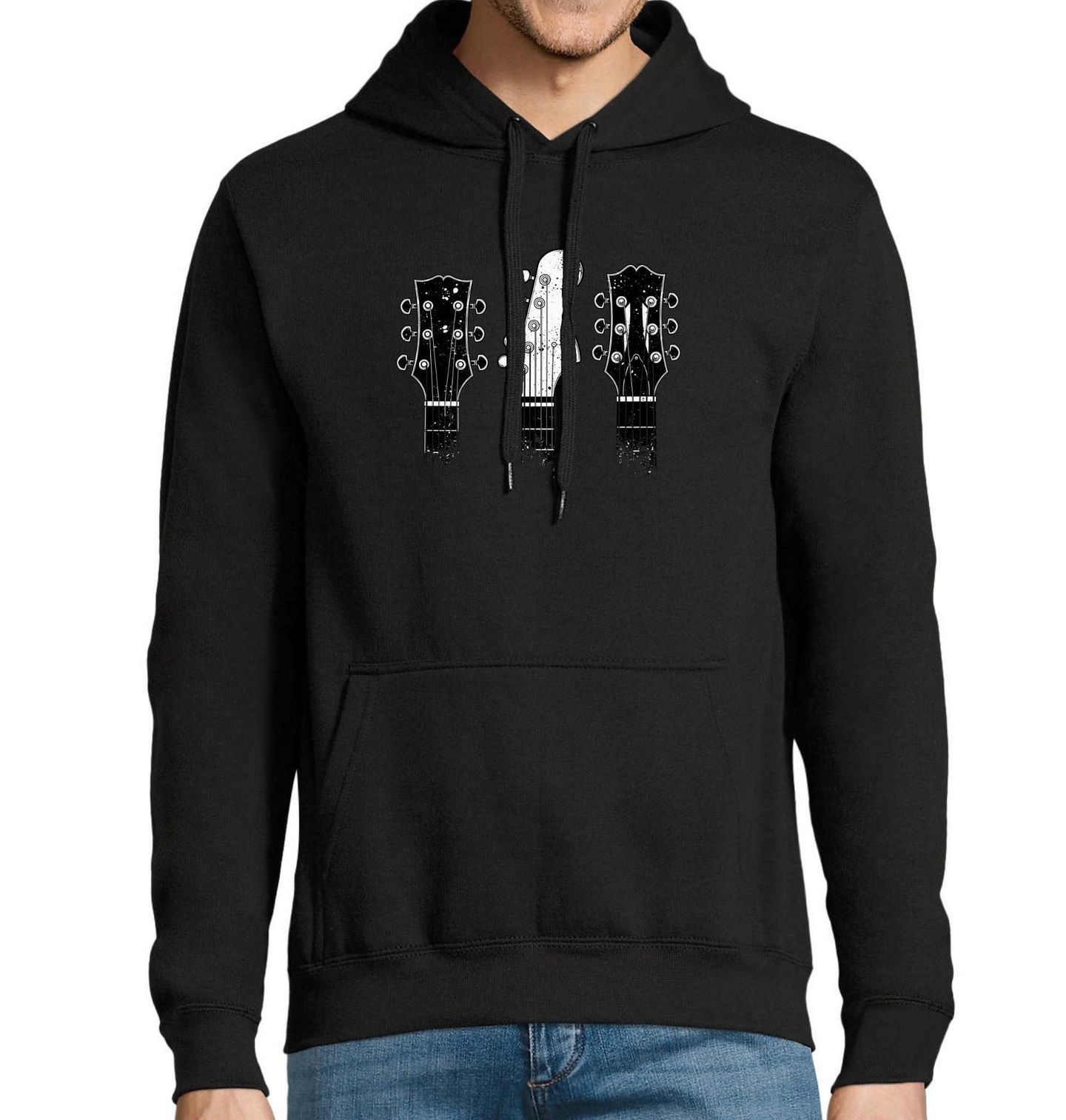 Pánská mikina Vintage Kytarové Hlavy. Elegantní černobílý motiv zachycuje tři různé tvary hlav kytar v minimalistickém, lehce „vintage“ stylu. Každá kytara má svůj jedinečný charakter a společně vytvářejí moderní, ale zároveň nadčasový design, který ocení každý kytarista i fanoušek hudby.