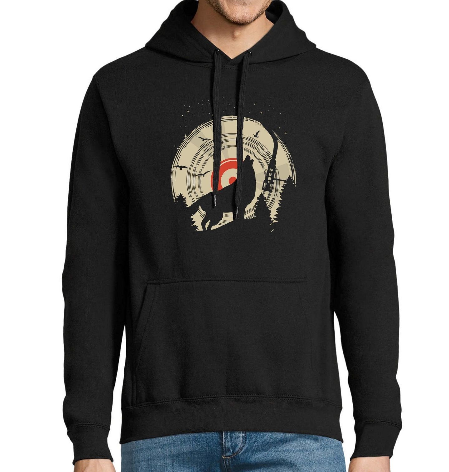 Pánská mikina Vinylový Vlk Vinyl Wolf. Vlčí vytí v rytmu gramofonu. Stylový motiv, kde se temnota lesa potkává s hudbou — vlk vyje před vinylem připomínajícím měsíc, jehož střed vypadá jako terč nebo stará deska. Pro milovníky noční přírody, hudby a originálního stylu s nádechem tajemna.