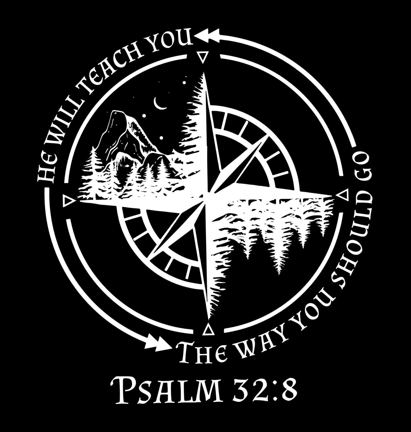 Pánská mikina Víra jako Kompas Života. Tento symbolický design kombinuje kompas s horskou krajinou a biblickým citátem „He will teach you the way you should go – Psalm 32:8“. Význam textu lze přeložit jako „On tě naučí cestě, po které máš jít“. Motiv vyjadřuje víru, duchovní vedení a důvěru v Boží plán, který člověka vede správným směrem.