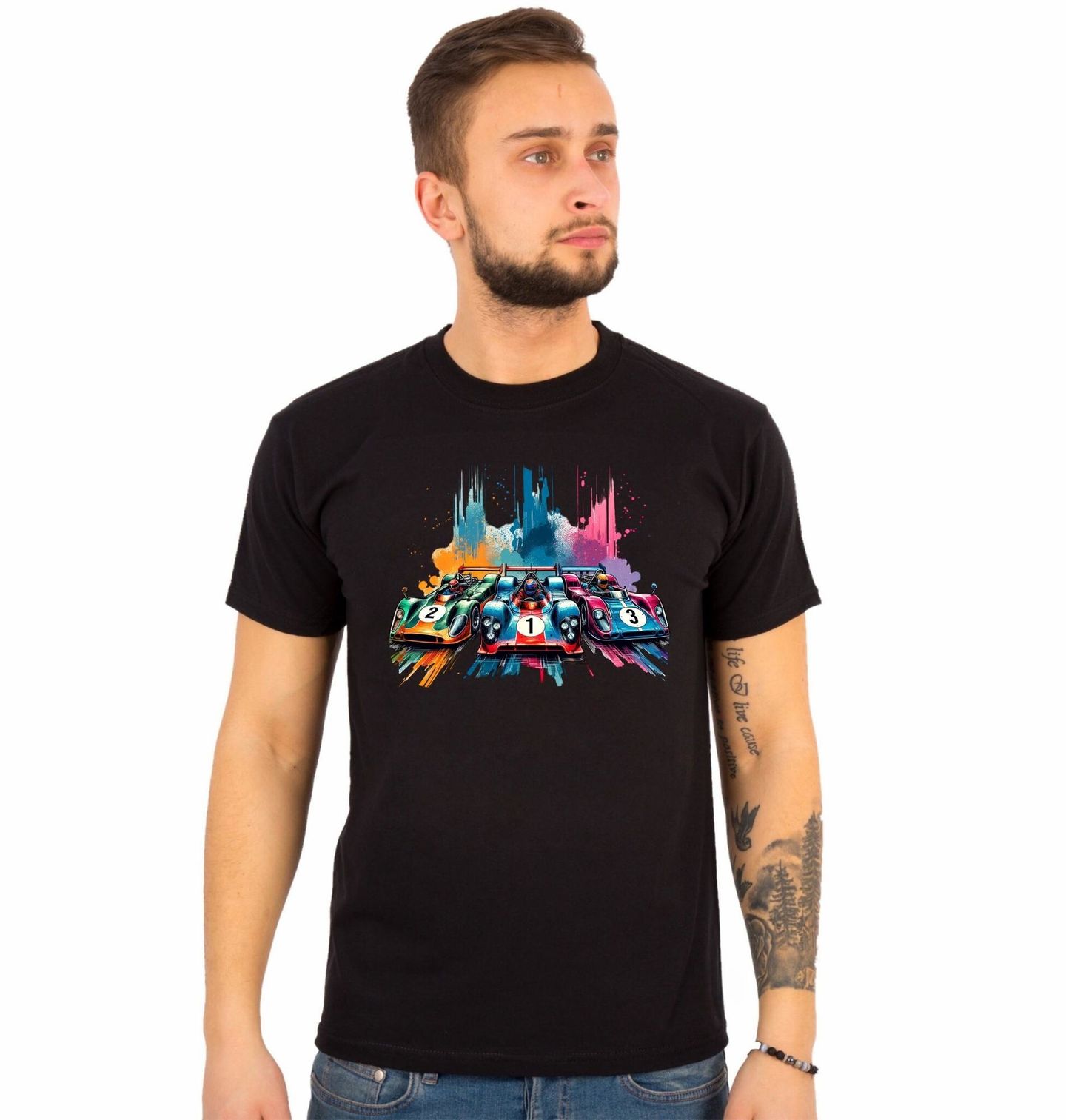Pánské tričko Vítězná Trojice Le Mans. Motiv zachycuje tři historická závodní auta ve stylu vytrvalostních závodů 24 hodin Le Mans ze 60.–70. let. Jde o ikonické sportovní prototypy s uzavřenou karoserií, které soupeřily o vítězství v těch nejtvrdších závodech světa. Motiv je ideální pro fanoušky motorsportu, klasických závodů a světa, kde hraje hlavní roli rychlost, technika a vášeň o auto.