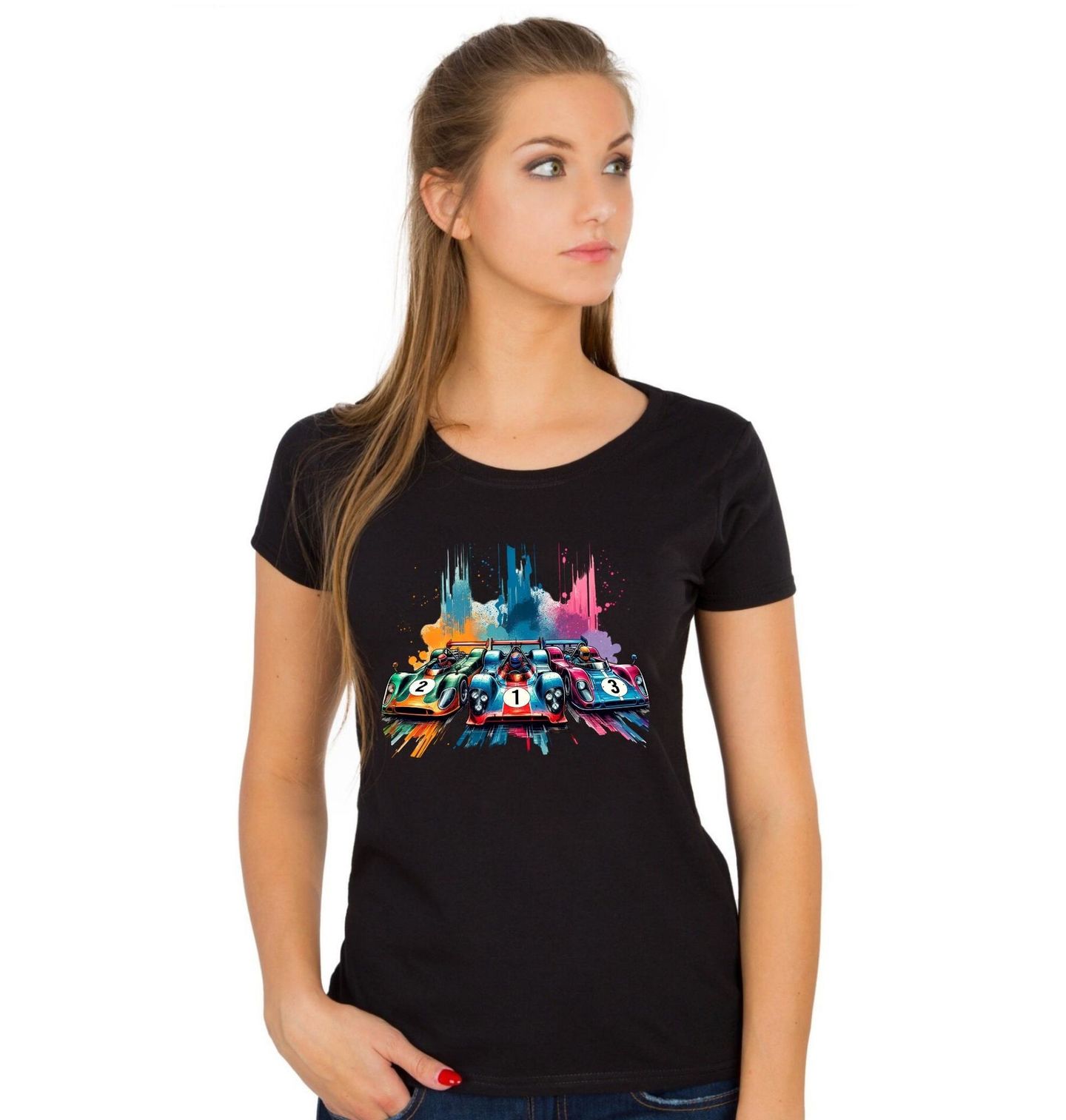 Dámské tričko Vítězná Trojice Le Mans. Motiv zachycuje tři historická závodní auta ve stylu vytrvalostních závodů 24 hodin Le Mans ze 60.–70. let. Jde o ikonické sportovní prototypy s uzavřenou karoserií, které soupeřily o vítězství v těch nejtvrdších závodech světa. Motiv je ideální pro fanoušky motorsportu, klasických závodů a světa, kde hraje hlavní roli rychlost, technika a vášeň o auto.