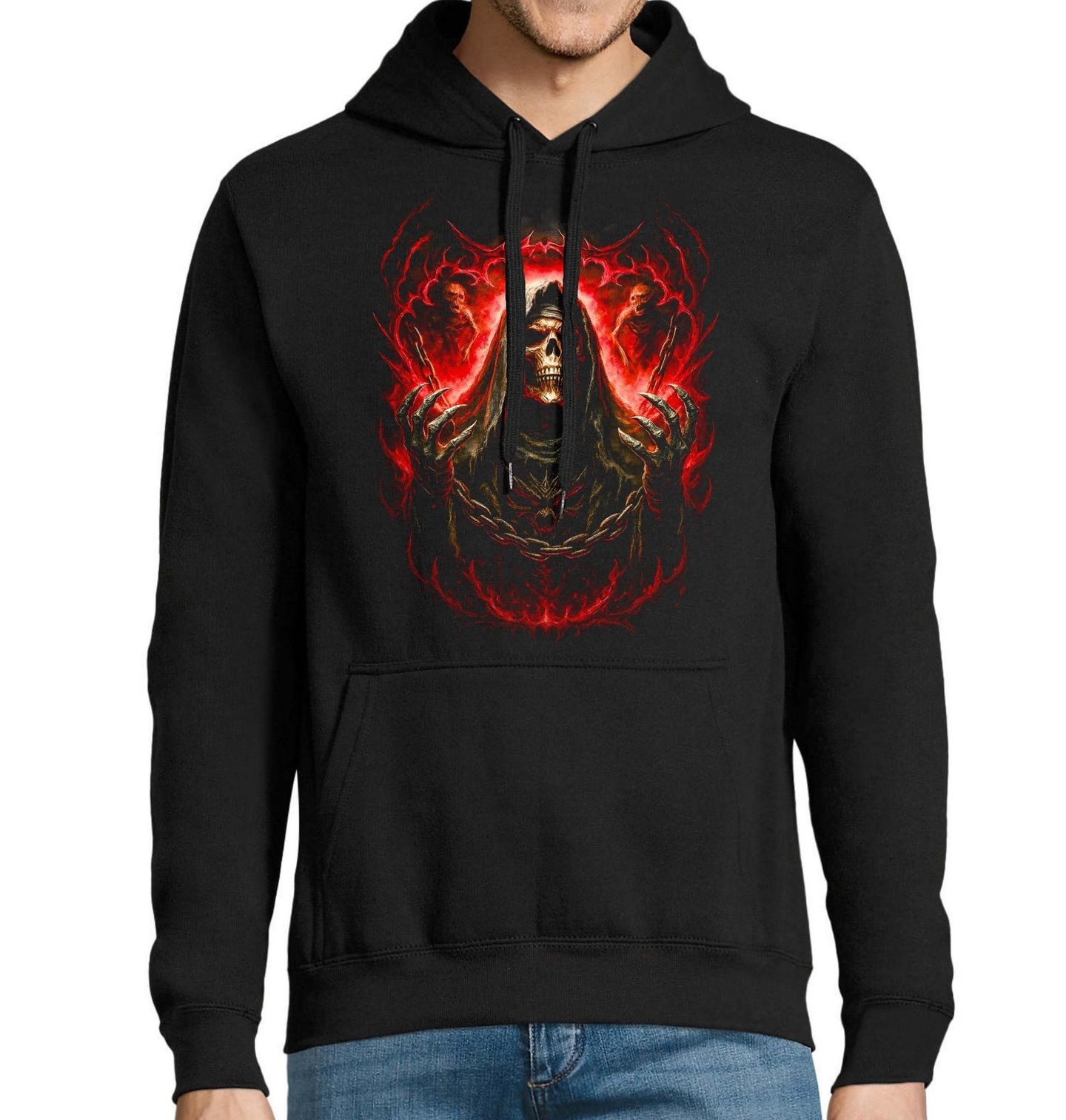 Pánská mikina Vládce Pekla v Řetězech. Temný a výrazný motiv, kde kostlivec vystupuje přímo z pekla, obklopen plameny, stíny a démonickou energií. Tento design zaujme každého milovníka hororu, dark artu a metalové estetiky. Kostlivec zde nepůsobí jen jako symbol smrti, ale jako vládce pekla, který ovládá síly chaosu a temnoty.