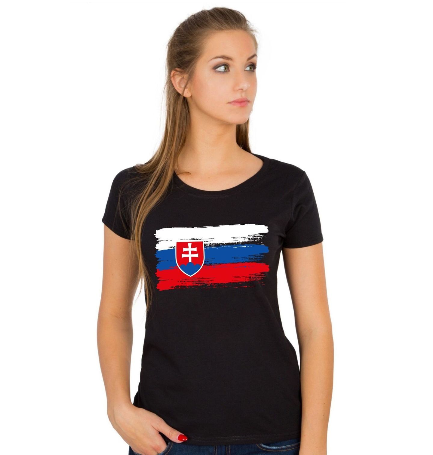 Dámské tričko Vlajka Slovenska. Motiv s ikonickou vlajkou Slovensko v moderním štětcovém stylu je dokonalou volbou pro každého, kdo chce vyjádřit svou národní hrdost stylově a originálně. Tato slovenská vlajka se symbolem státního znaku je ideální pro fanoušky, vlastence i pro milovníky Slovenska.