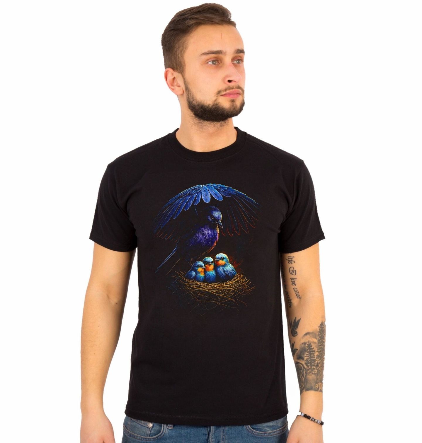 Pánské tričko Vlaštovka obecná s Mláďaty. Silný a emotivní motiv zachycuje pták inspirovaný druhem vlaštovka, který svými roztaženými křídly chrání mláďata v hnízdě. Vlaštovka je oblíbený pták symbolizující rodinu, bezpečí a návrat domů. Detailní ilustrace zvýrazňuje kontrast tmavého opeření a jemných barev mladých ptáčat, což vytváří působivou kompozici plnou emocí.
