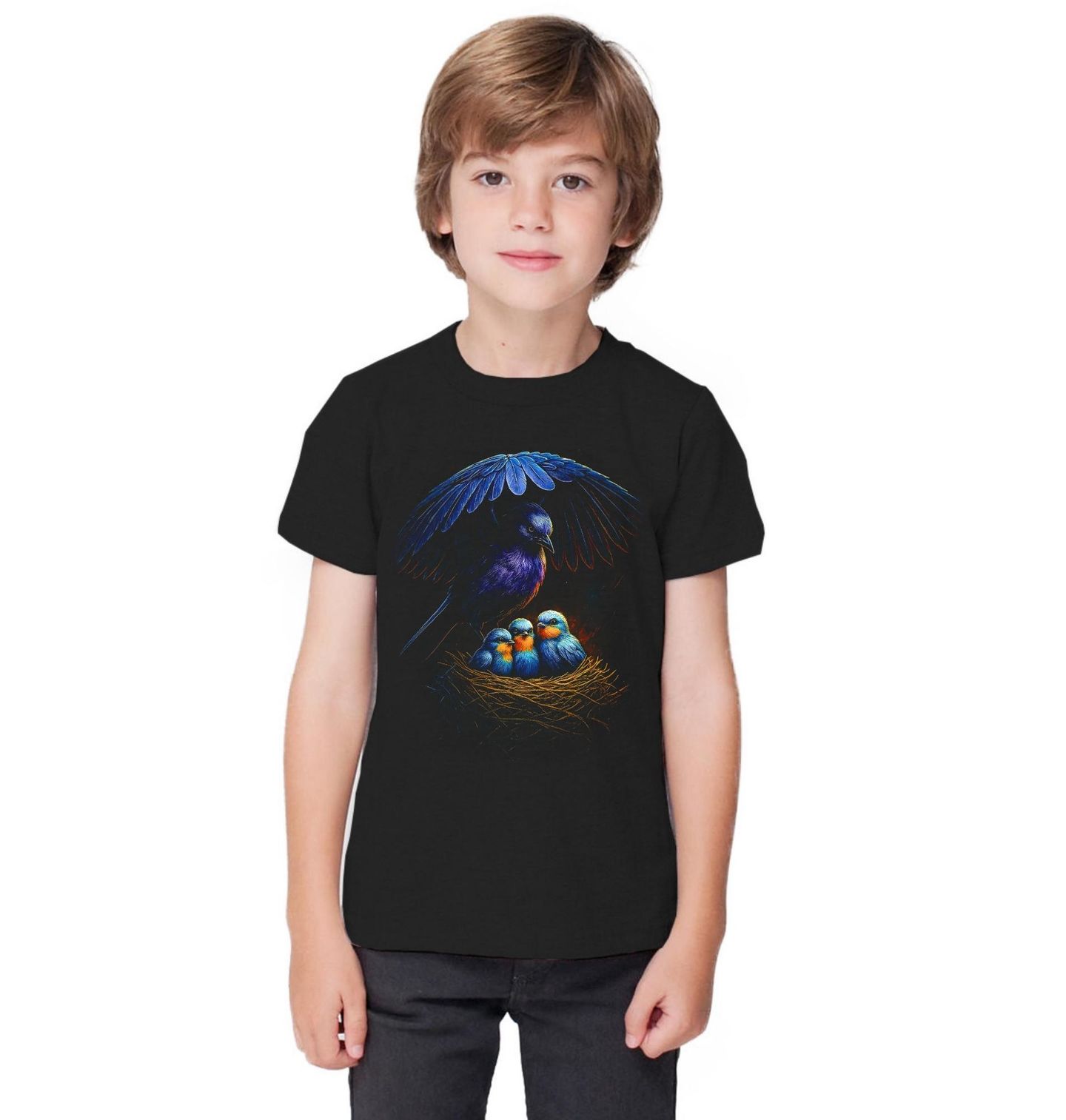 Dětské tričko Vlaštovka obecná s Mláďaty. Silný a emotivní motiv zachycuje pták inspirovaný druhem vlaštovka, který svými roztaženými křídly chrání mláďata v hnízdě. Vlaštovka je oblíbený pták symbolizující rodinu, bezpečí a návrat domů. Detailní ilustrace zvýrazňuje kontrast tmavého opeření a jemných barev mladých ptáčat, což vytváří působivou kompozici plnou emocí.