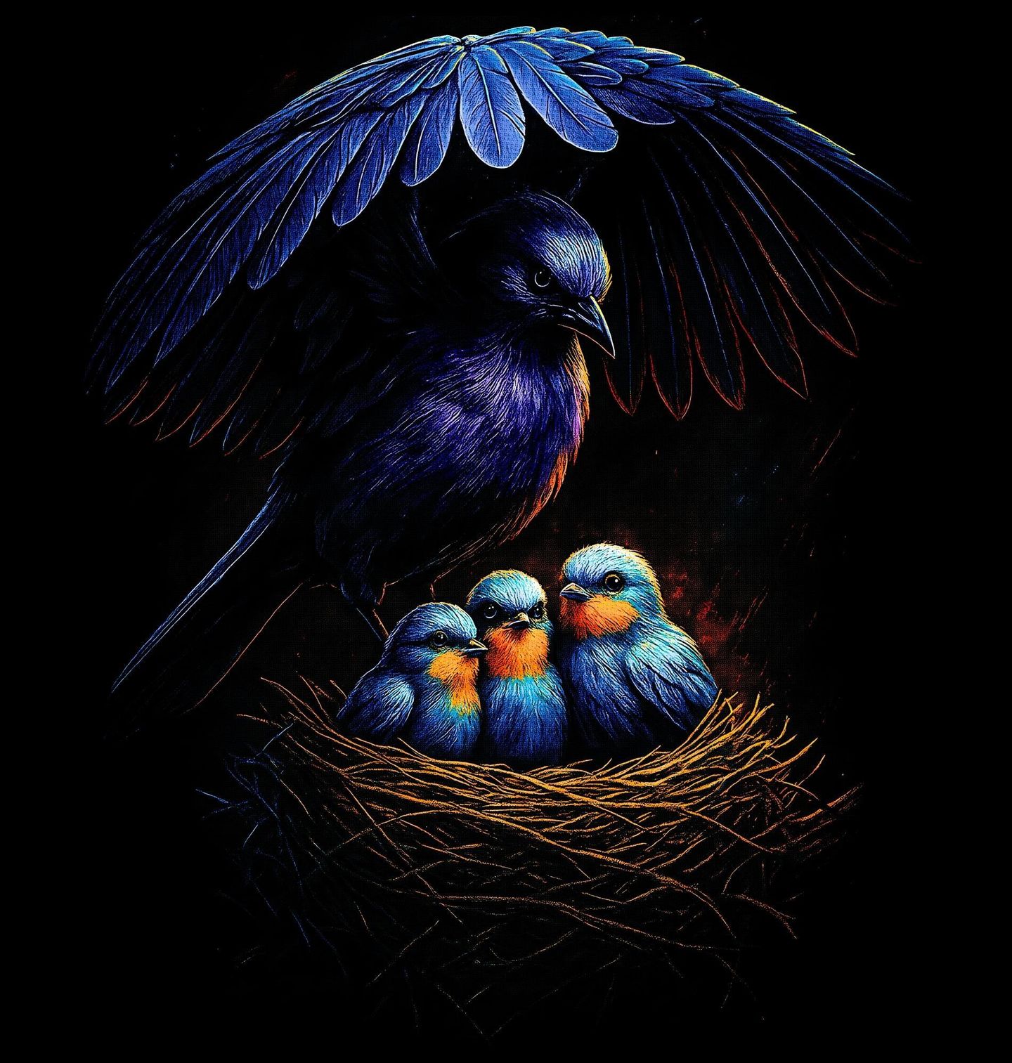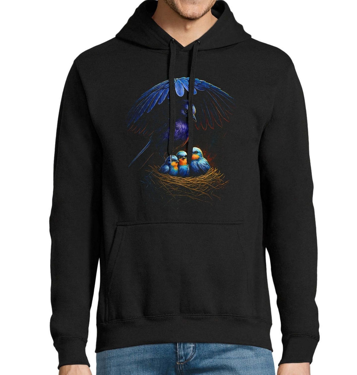 Pánská mikina Vlaštovka obecná s Mláďaty. Silný a emotivní motiv zachycuje pták inspirovaný druhem vlaštovka, který svými roztaženými křídly chrání mláďata v hnízdě. Vlaštovka je oblíbený pták symbolizující rodinu, bezpečí a návrat domů. Detailní ilustrace zvýrazňuje kontrast tmavého opeření a jemných barev mladých ptáčat, což vytváří působivou kompozici plnou emocí.