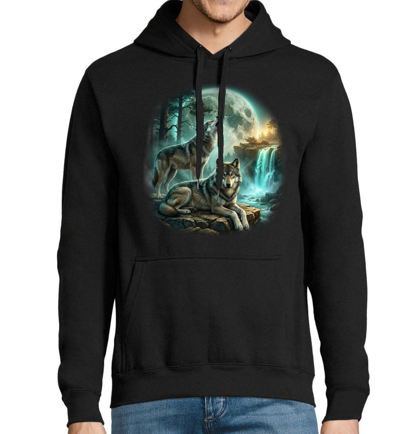 Pánská mikina Vlčí Smečka pod Měsícem. Podmanivý motiv zachycuje magickou noční krajinu, kde vlci stojí u vodopádu a jeden z nich vyje na zářící měsíc. Tajemná atmosféra lesa, mlhy a světla dodává celé scéně sílu a hloubku, kterou ocení každý milovník divoké přírody. Motiv vlk a vlci symbolizuje svobodu, věrnost smečce a instinkt, zatímco měsíc podtrhuje mystiku a klid nočního světa.