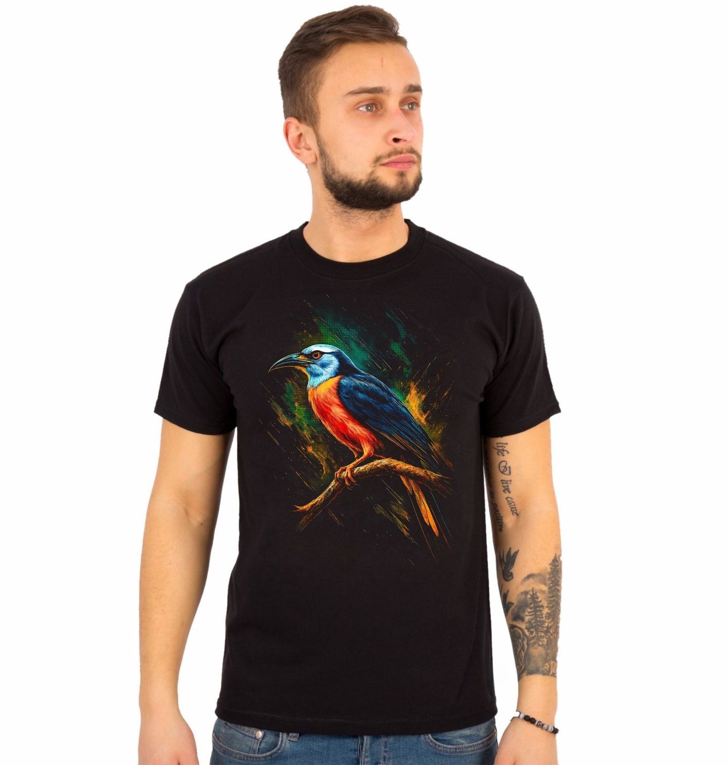 Pánské tričko Vlha núbijská. Barevný pták vlha (Merops nubicus) patří mezi nejkrásnější druhy tropických vlh a je známý svým elegantním tvarem těla a výraznými kontrastními barvami. Tento stylizovaný motiv zachycuje pták vlha nachová v dynamickém uměleckém provedení, které zvýrazňuje jeho modrou hlavu, teplé červené tóny a ladný posed na větvi.