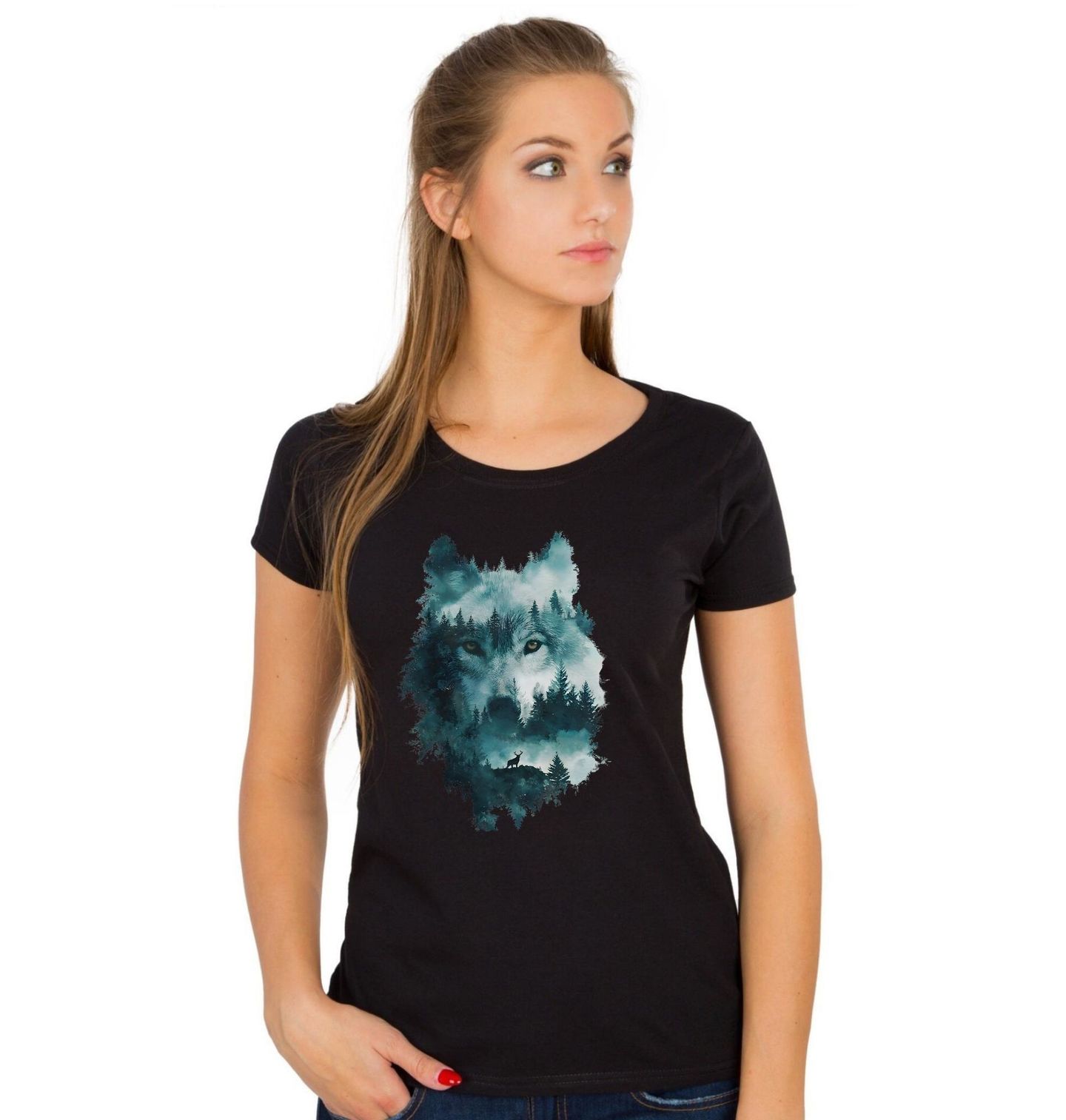 Dámské tričko Vlk na Lovu. Tento nádherný umělecký motiv propojuje majestátní vlk a siluetu hlubokých jehličnatých stromů. Uprostřed klidné krajiny stojí hrdý jelen, který dotváří atmosféru svobody, síly a respektu k přírodě. Hlavním prvkem je les, který se prolíná s tváří vlka a vytváří tak jedinečný a tajemný obraz.