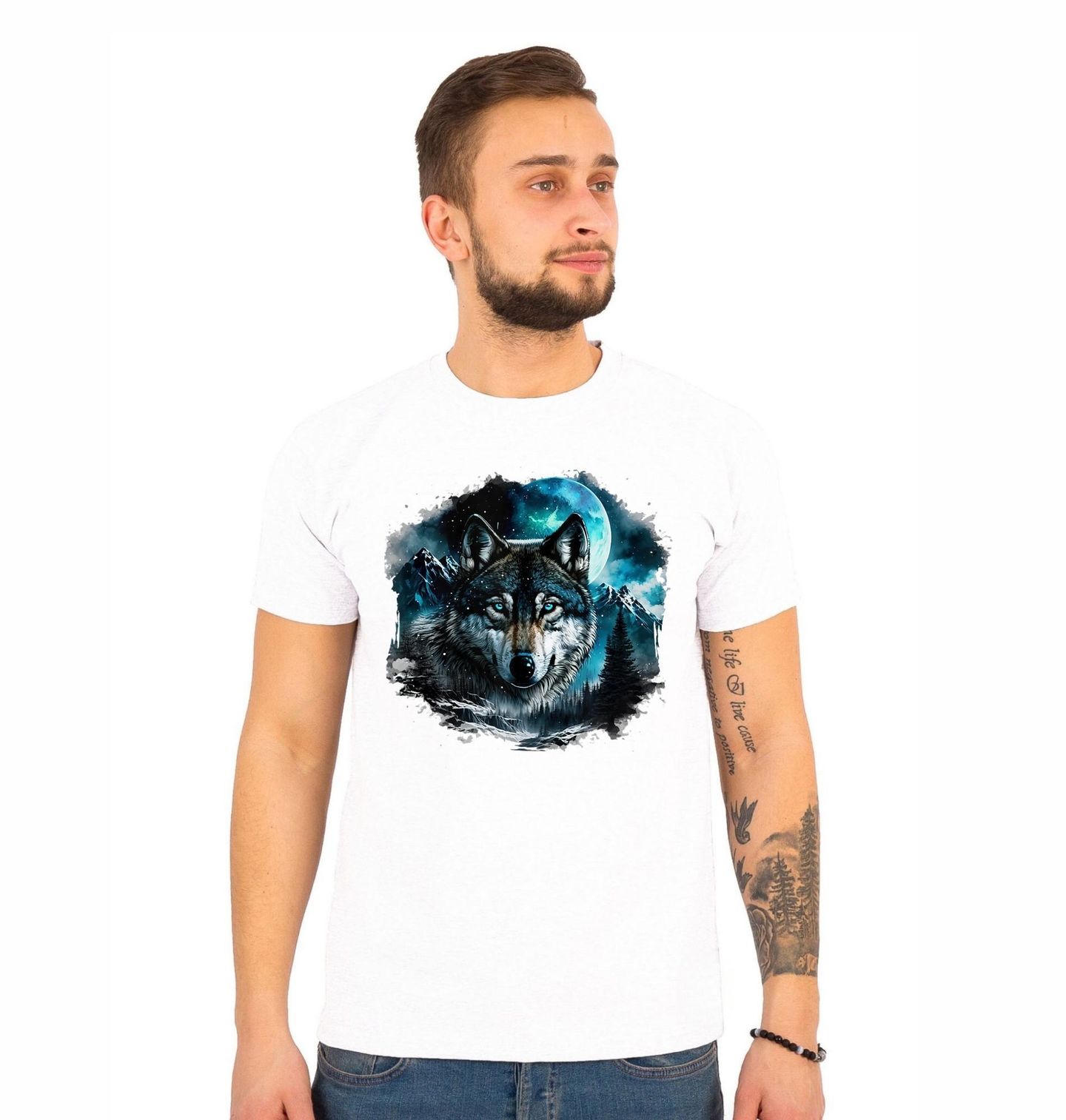 Pánské tričko Vlk při Úplňku. Tento nádherný vlk s pronikavýma modrýma očima je zasazen do zimní krajiny pod tajemným měsícem. Vlk zde symbolizuje sílu, vytrvalost a krásu divokých plemen. Detailní zpracování a chladné barvy vytvářejí jedinečný motiv, který osloví každého milovníka psů i divoké přírody.