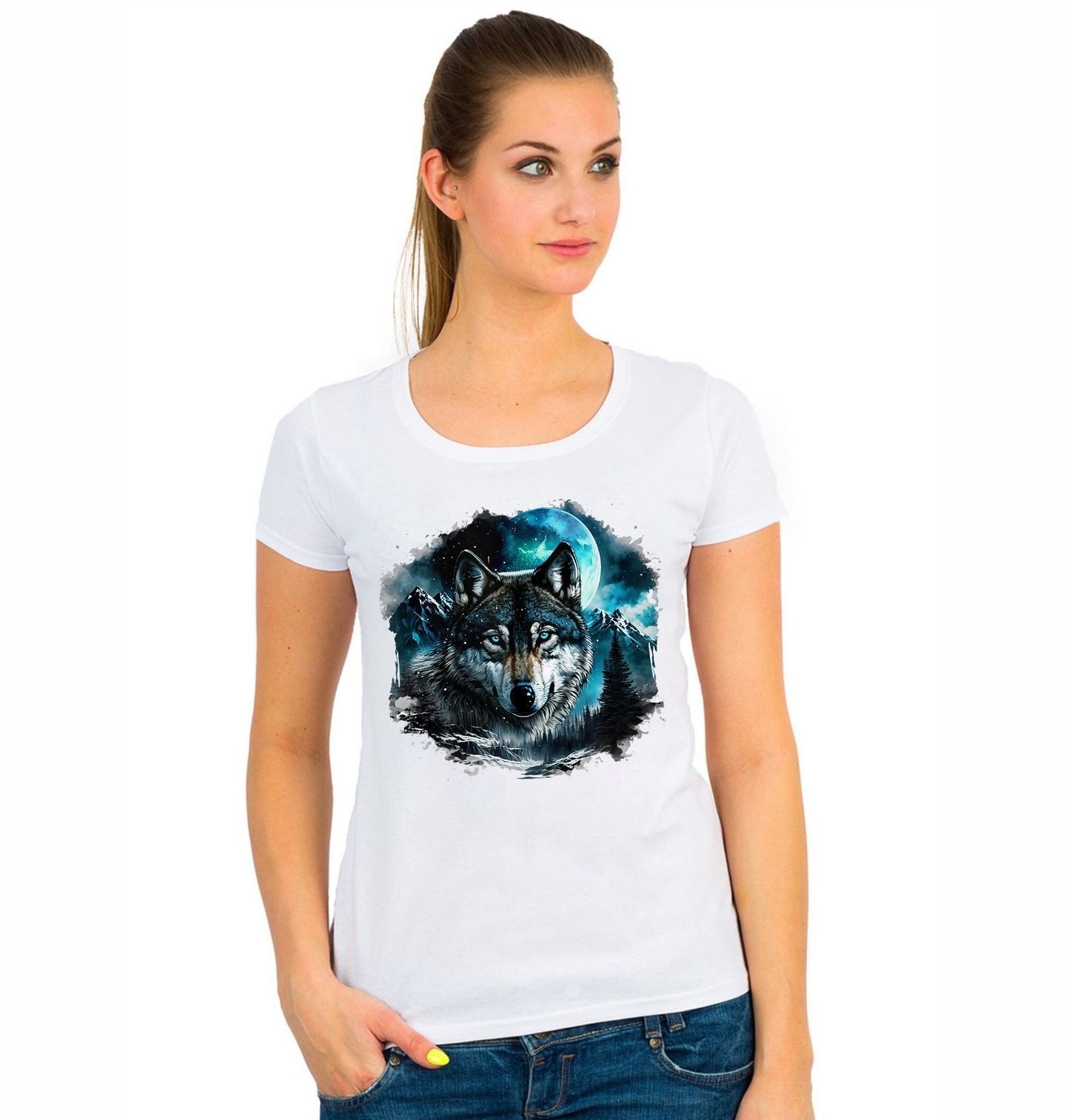 Dámské tričko Vlk při Úplňku. Tento nádherný vlk s pronikavýma modrýma očima je zasazen do zimní krajiny pod tajemným měsícem. Vlk zde symbolizuje sílu, vytrvalost a krásu divokých plemen. Detailní zpracování a chladné barvy vytvářejí jedinečný motiv, který osloví každého milovníka psů i divoké přírody.