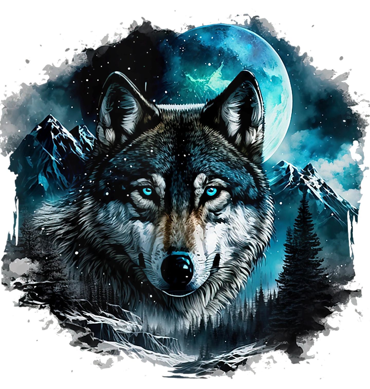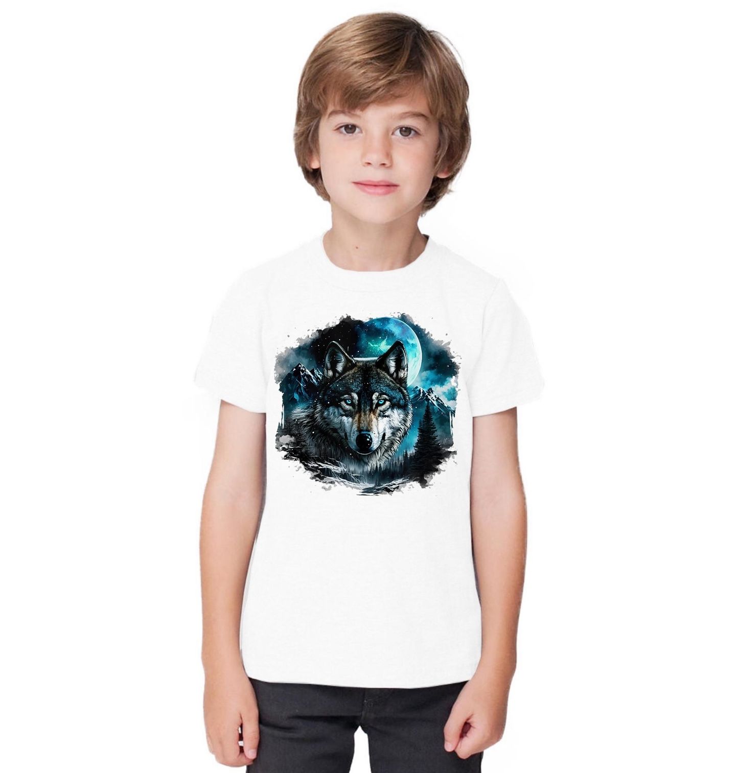 Dětské tričko Vlk při Úplňku. Tento nádherný vlk s pronikavýma modrýma očima je zasazen do zimní krajiny pod tajemným měsícem. Vlk zde symbolizuje sílu, vytrvalost a krásu divokých plemen. Detailní zpracování a chladné barvy vytvářejí jedinečný motiv, který osloví každého milovníka psů i divoké přírody.