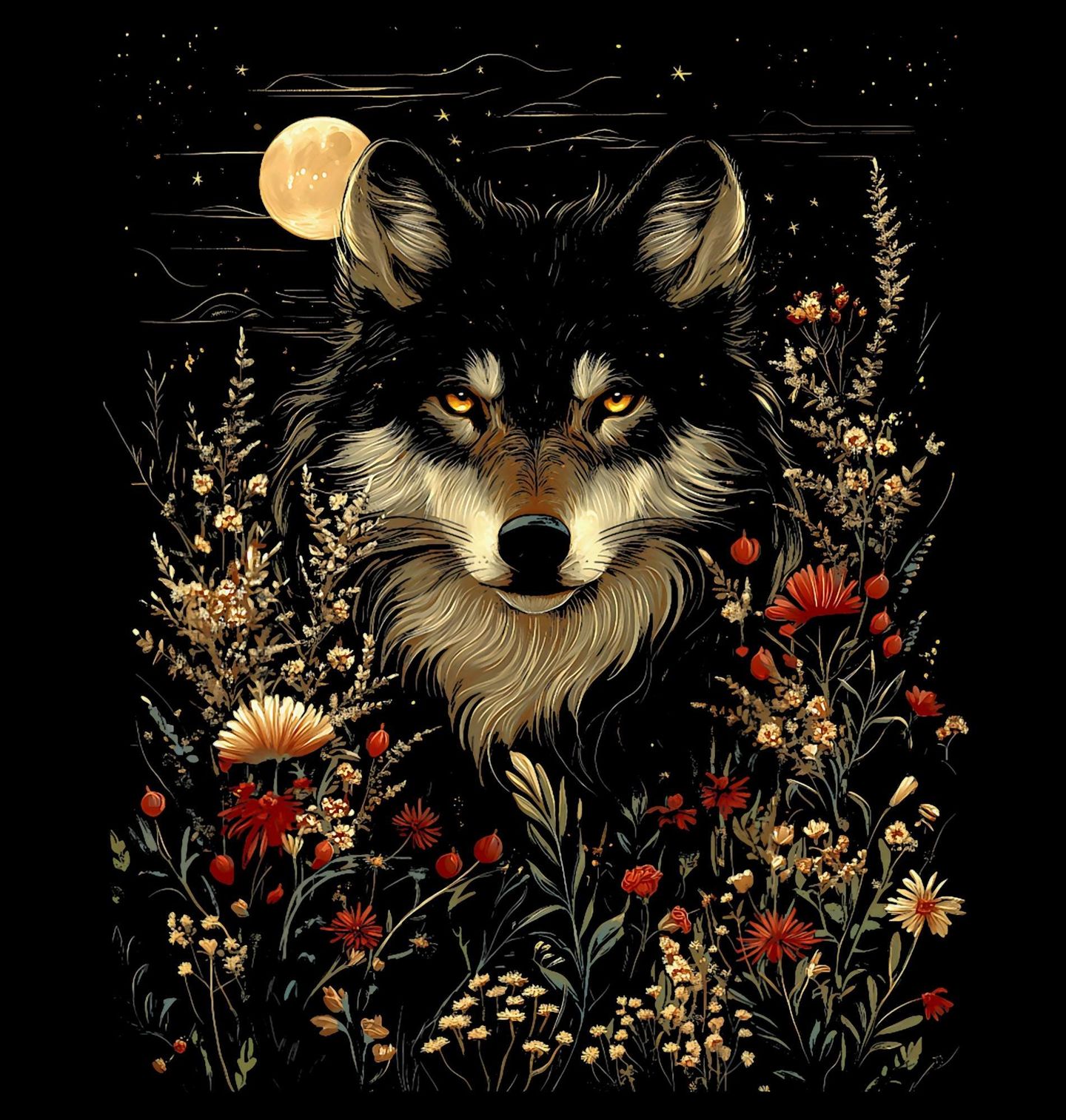 Dámské tričko Vlk v Noční Divočině. Kouzelný obraz spojující sílu a klid – vlk v tiché noční krajině, obklopený rozkvetlými květinami a osvětlený zářící lunou. Tento detailně propracovaný motiv v sobě nese mystiku divočiny, svobodu ducha a krásu přírody.