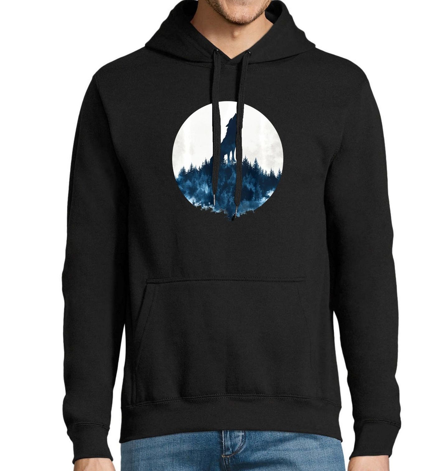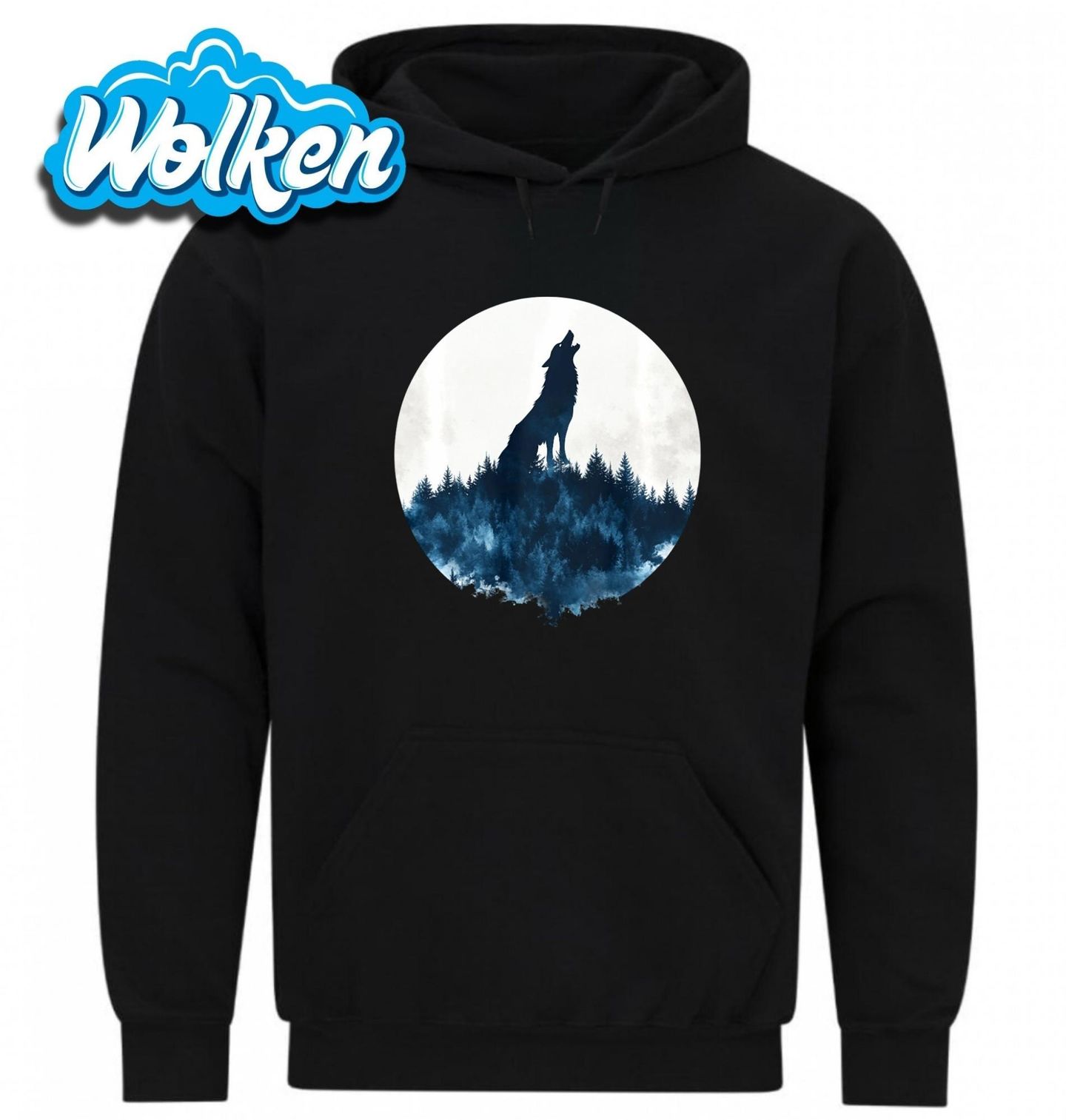 Pánská mikina Vlk Vyjící v Měsíčním Světle. Motiv zachycuje majestátní siluetu vlka, který vyje k obloze z vrcholku temného lesa, zatímco za ním září úplněk měsíce. Kombinace hlubokých odstínů modré a bílé vytváří tajemnou a magickou atmosféru, která osloví všechny milovníky přírody, volnosti a noční divočiny.