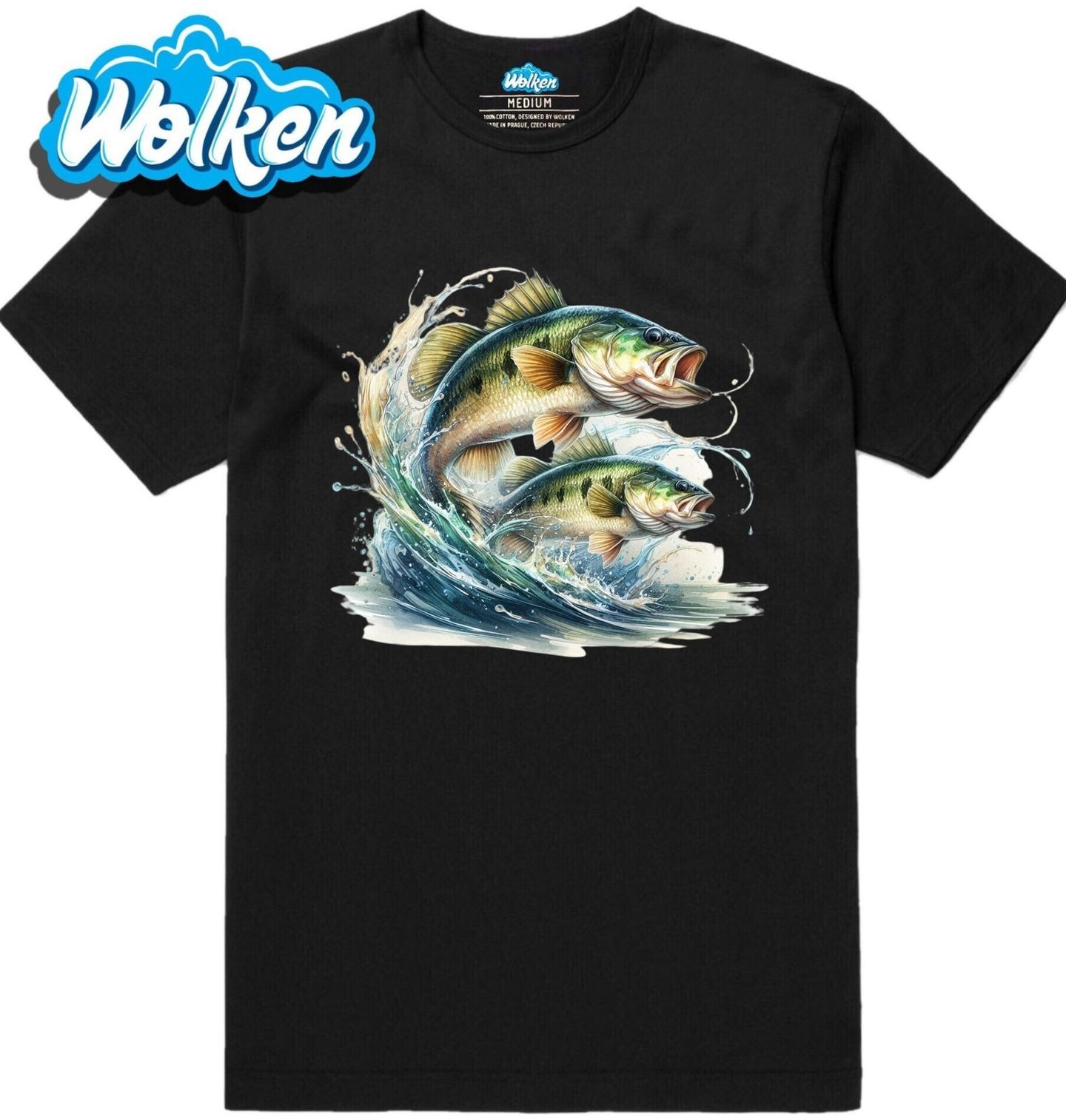 Pánské tričko Vodní souboj Okounů. Dvě dynamické ryby v plné síle, zachycené v momentu výskoku nad hladinou – to je motiv, který potěší každého vášnivého rybáře. Tento design zachycuje ikonického okounka pstruhového (anglicky Largemouth Bass), jednoho z nejoblíbenějších druhů pro sportovní rybaření.