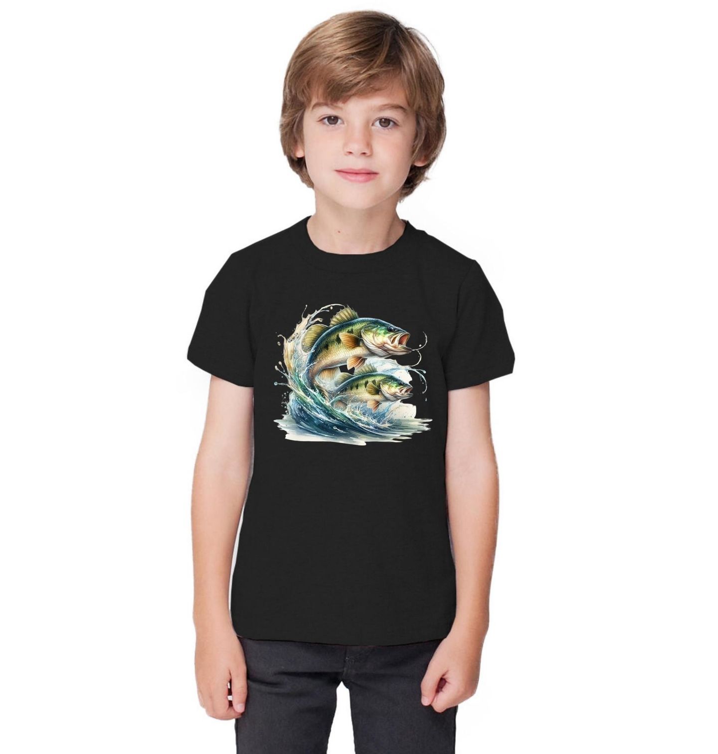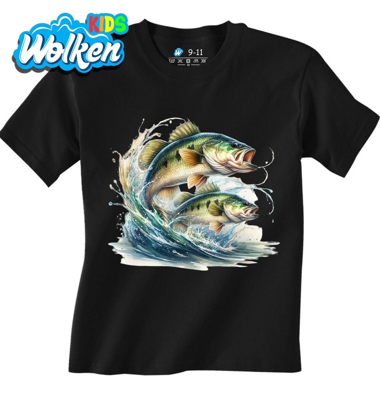 Dětské tričko Vodní souboj Okounů. Dvě dynamické ryby v plné síle, zachycené v momentu výskoku nad hladinou – to je motiv, který potěší každého vášnivého rybáře. Tento design zachycuje ikonického okounka pstruhového (anglicky Largemouth Bass), jednoho z nejoblíbenějších druhů pro sportovní rybaření.