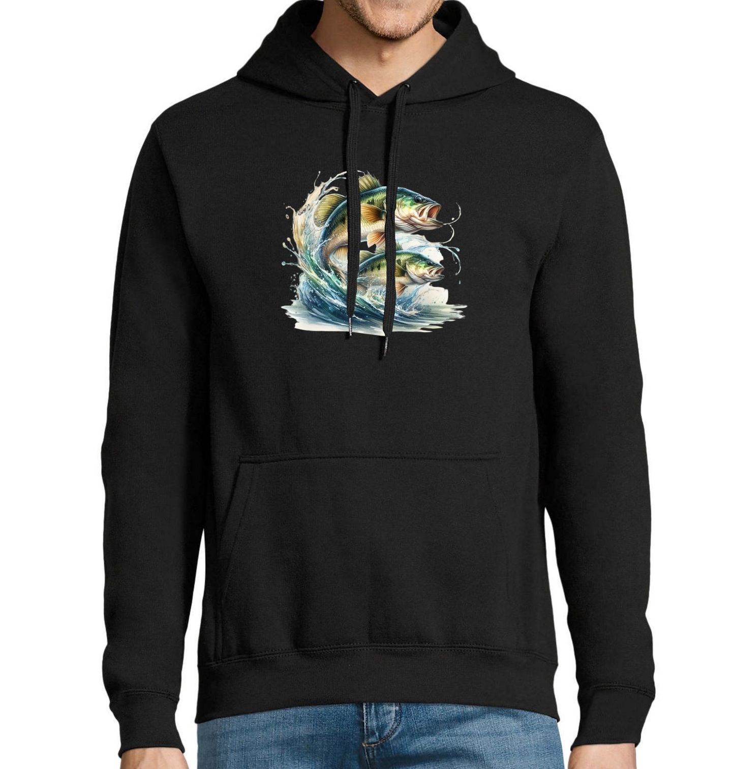 Pánská mikina Vodní souboj Okounů. Dvě dynamické ryby v plné síle, zachycené v momentu výskoku nad hladinou – to je motiv, který potěší každého vášnivého rybáře. Tento design zachycuje ikonického okounka pstruhového (anglicky Largemouth Bass), jednoho z nejoblíbenějších druhů pro sportovní rybaření.