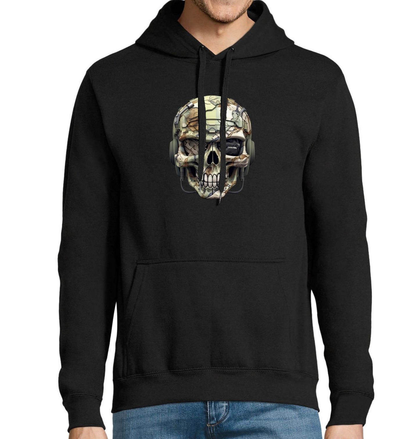 Pánská mikina Vojenská Maskáčová Lebka. Realisticky zpracovaná lebka je doplněná o maskáčový vzor, detaily helmy a technické prvky, díky čemuž působí drsně, odhodlaně a neskutečně působivě. Tento motiv je ideální pro všechny, kdo milují vojenský styl, adrenalin a výraznou grafiku, která okamžitě upoutá pozornost.