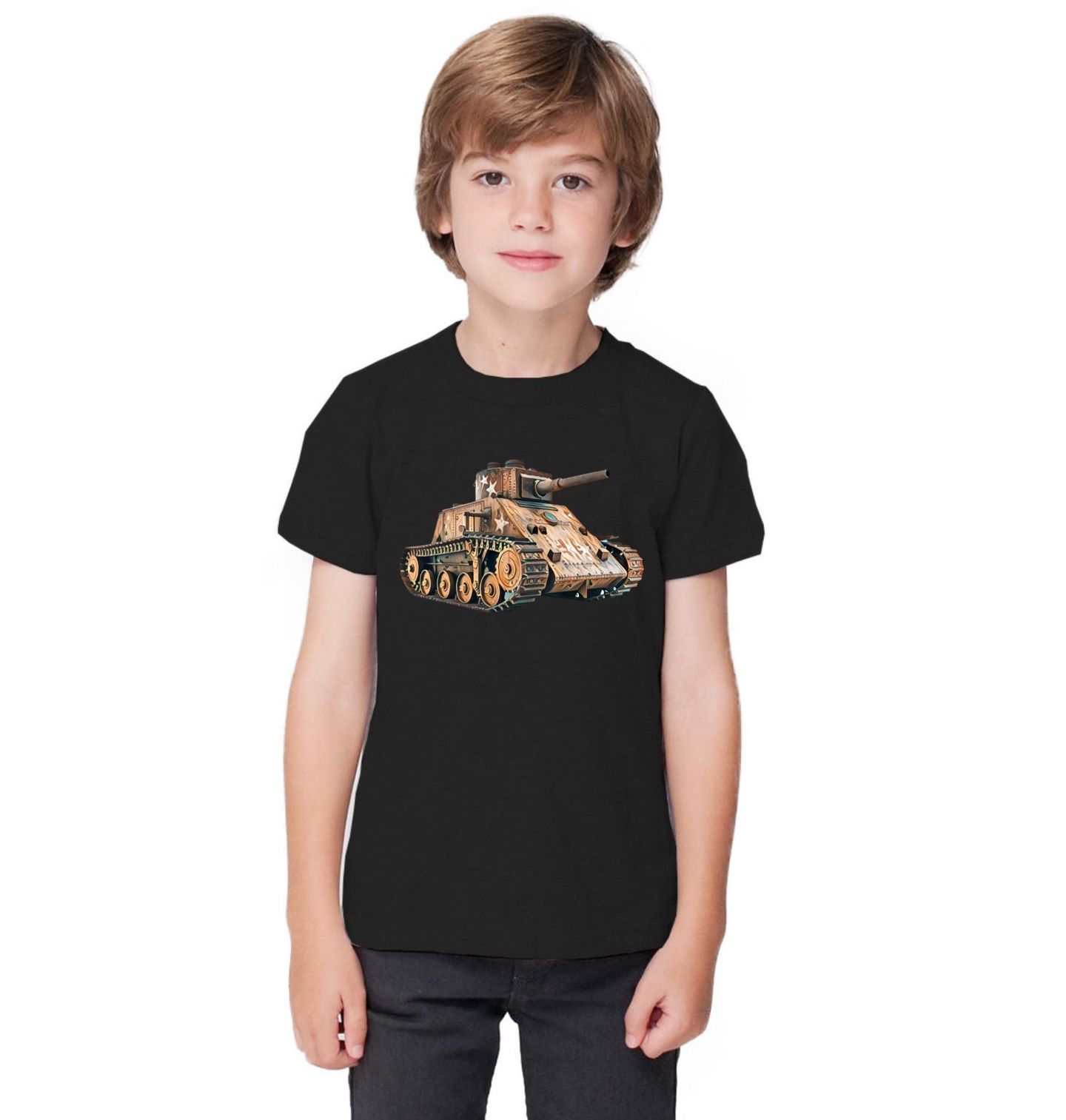 Dětské tričko Vojenský Tank Druhé Světové Války. Tento stylový motiv s realistickým zpracováním ukazuje detailní tank jako symbol síly, odvahy a strategie. Tank zde působí jako neporazitelný obr, který patří do světa, kde hlavní roli hraje armáda a její bojová technika. Motiv potěší každého fanouška vojenské historie, modelů i her s vojenskou tematikou.