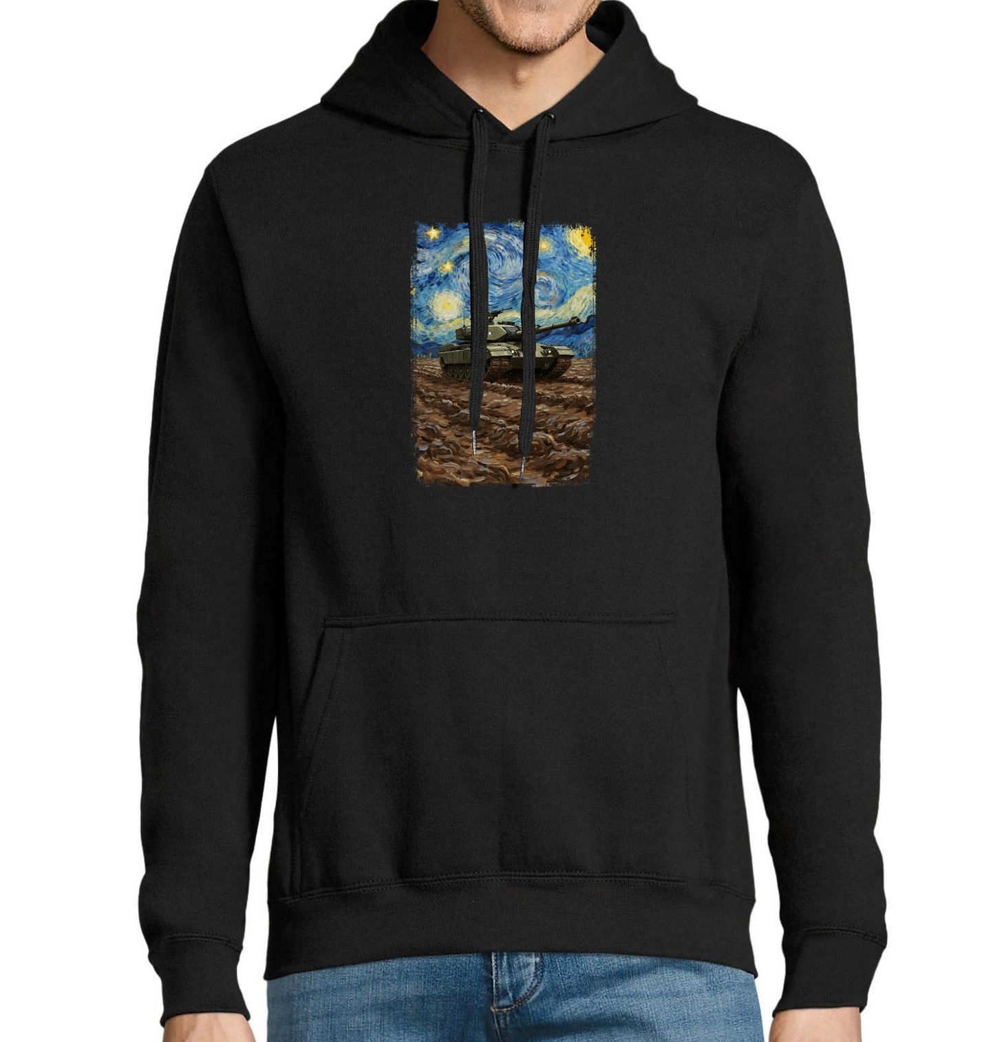 Pánská mikina Vojenský Tank ve Hvězdné Noci. Originální motiv, který spojuje svět umění a vojenské techniky. Uprostřed snové krajiny stojí výrazný tank, nad kterým se na obloze vlní slavná Hvězdná noc. Malířský styl inspirovaný mistrem jménem Vincent Van Gogh dodává celému obrazu jedinečnou atmosféru, kdy se romantické barvy setkávají s technickou silou světa, který představuje armáda.