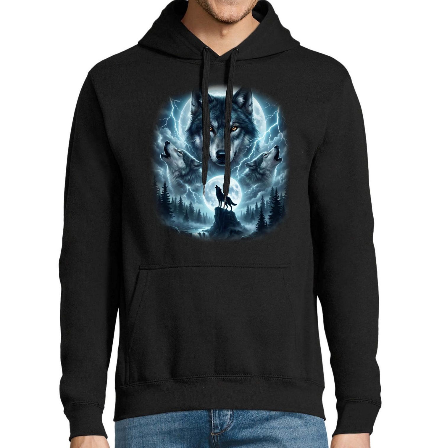 Pánská mikina Volání Smečky. Působivý a dramatický vlk jako symbol síly, dominance a moudrosti. Vlci vyjí pod zářící měsíc v bouřlivé noční krajině. Blesky, temné mraky a hluboký les vytvářejí silnou atmosféru, která podtrhuje divokou energii přírody. Motiv vlk a vlci v kombinaci s měsíc přináší pocit svobody, odvahy a propojení se smečkou i instinkty.