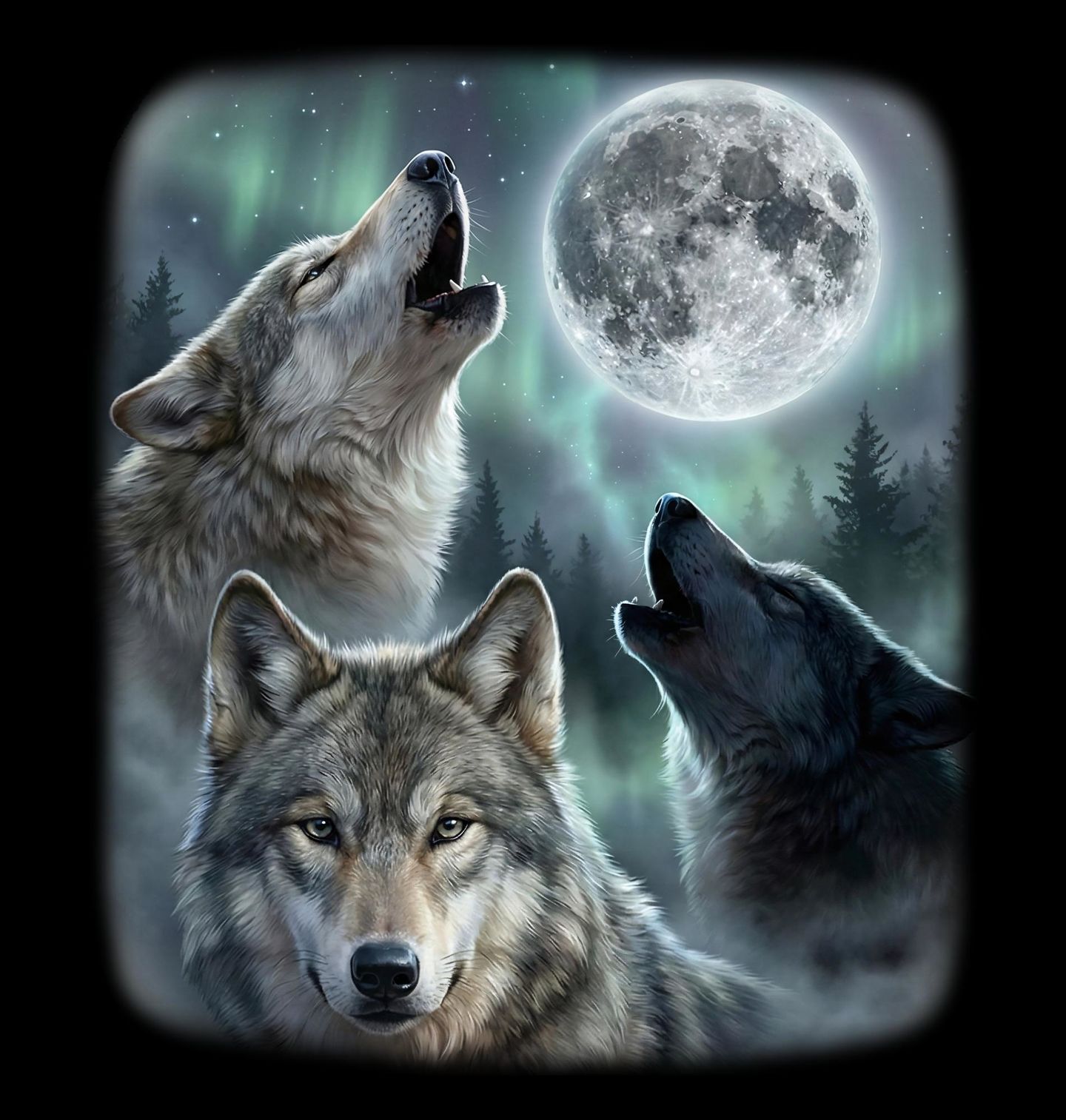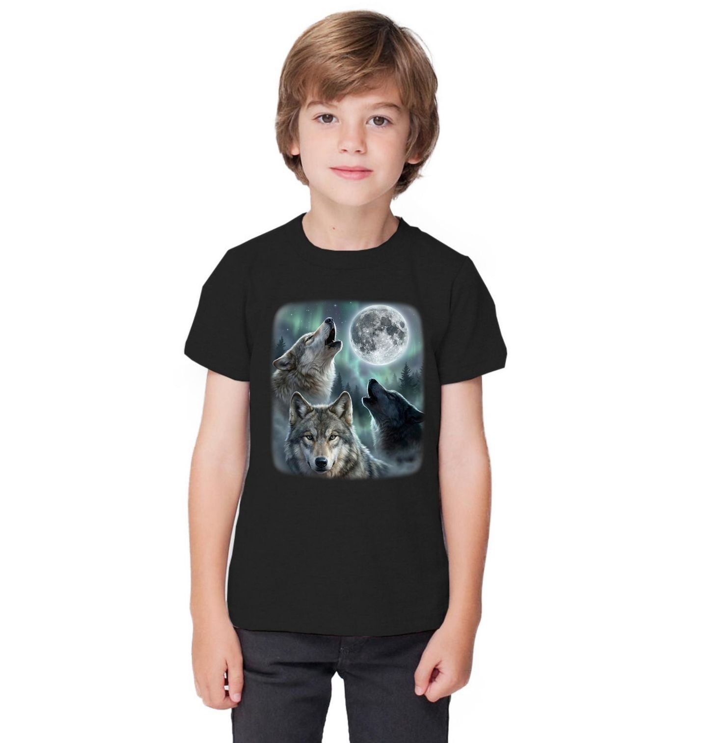 Dětské tričko Volání Vlků pod Měsícem. Silný a mystický motiv zachycuje vlk ve své přirozené kráse, obklopený noční krajinou, kde vlci vyjí na jasný měsíc. Tento design evokuje divokost, svobodu a hluboké instinkty přírody, které vlci symbolizují. Kombinace temného lesa, polární záře a zářícího měsíce vytváří jedinečnou atmosféru, která osloví každého milovníka přírody a zvířat.
