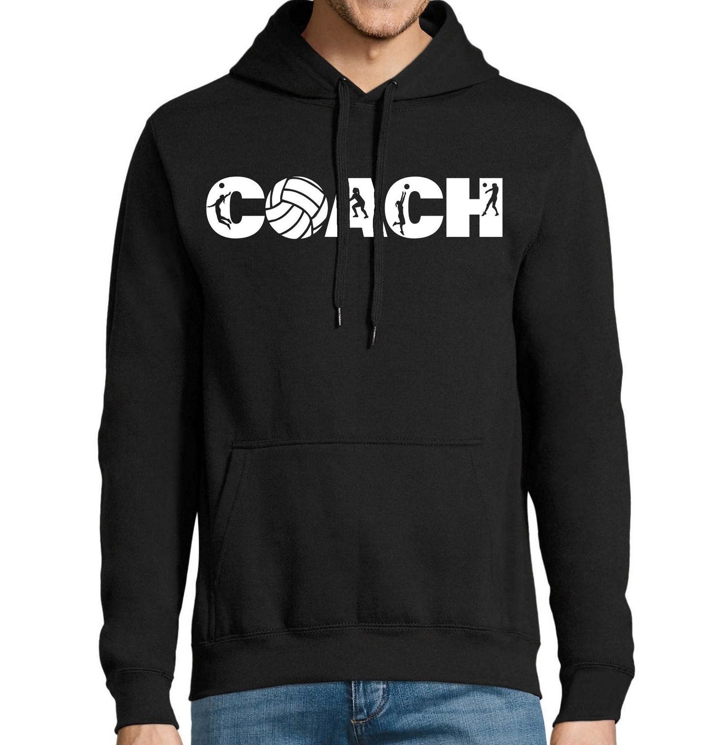 Pánská mikina Volejbalový Coach. Kreativní design s nápisem „COACH“ doplněný siluetami volejbalových hráčů a míčem. Tento design vyjadřuje energii, vedení a týmového ducha. Ideální pro každého trenéra nebo fanouška volejbalu.