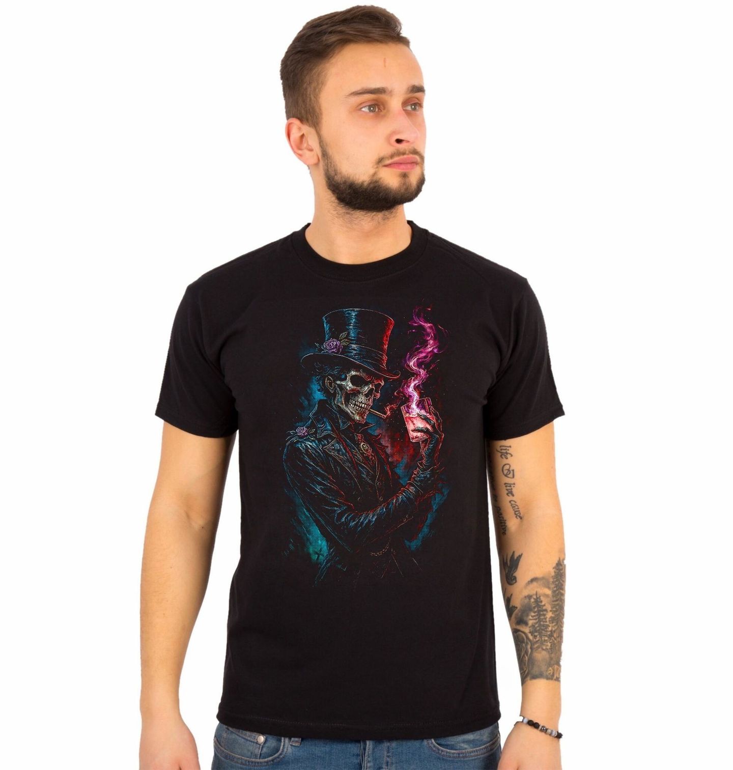 Pánské tričko Voodoo Baron Samedi. Baron Samedi je především strážcem podsvětí. Lidé se s ním setkávají v poslední chvíli svého života. Baron jim pak prý vykope hrob. A když se duše odpojí od těla, pozdraví ji a odvede do posmrtného života. Na hlavě má cylindr, který doplňuje černý frak. Nosí tmavé brýle, kouří doutník a popíjí typický rum kořeněné chuti. Dominantní kostlivec v elegantním obleku a cylindru drží sklenku a doutník, čímž vytváří jedinečný kontrast mezi smrtí a noblesou.