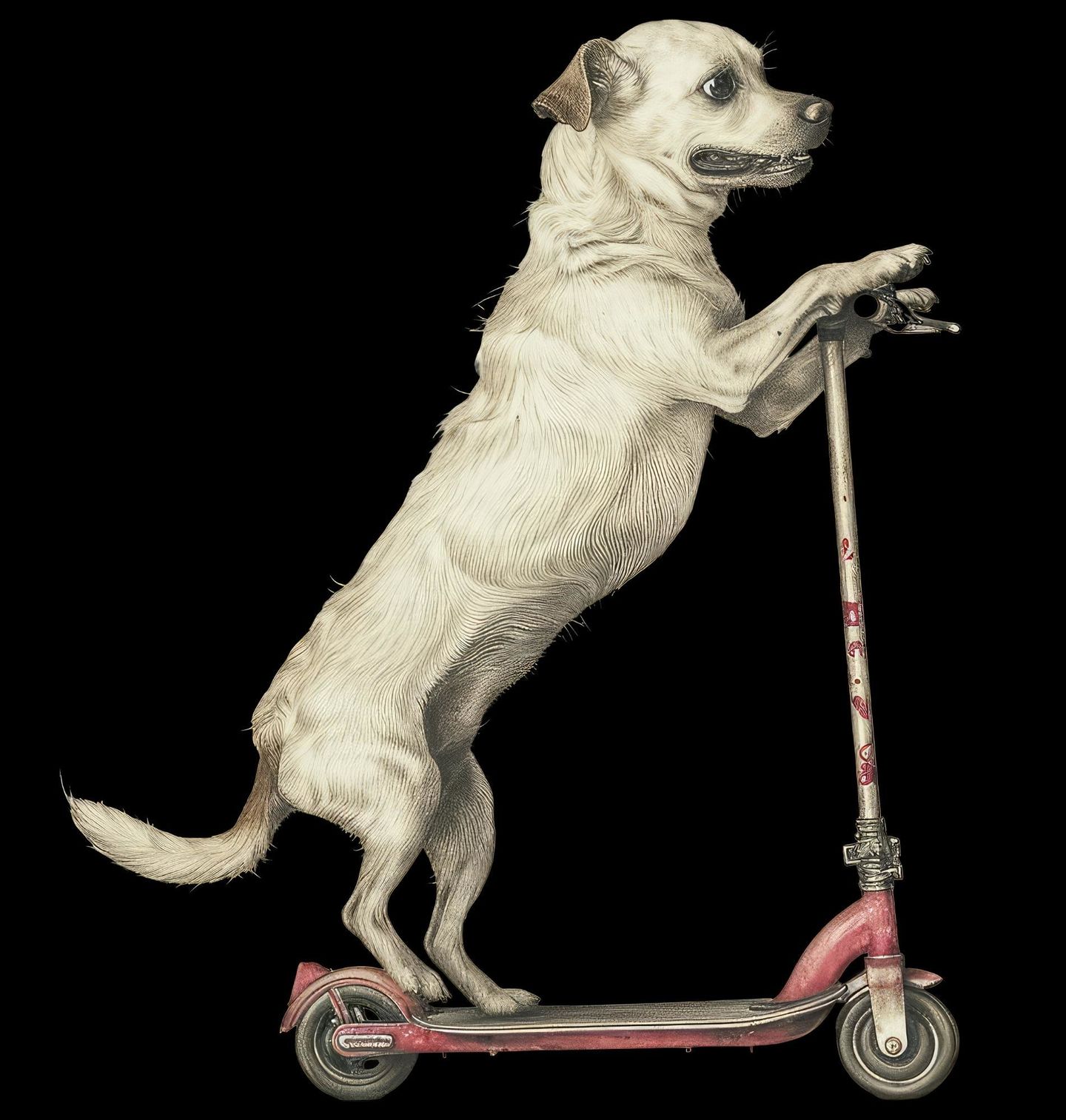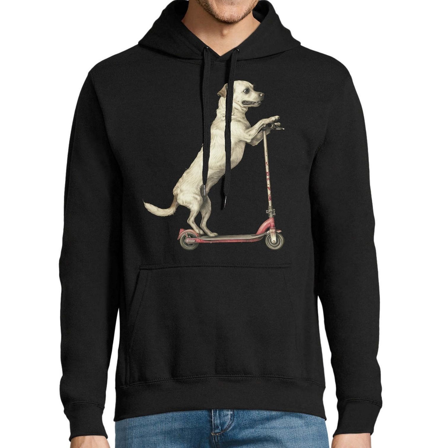 Pánská mikina Voříšek na Koloběžce. Podle vzhledu jde nejpravděpodobněji o křížence malého plemene Jack Russell teriér. Tenhle pes se s obyčejnou procházkou nespokojí. Naskočí na koloběžku, chytí řídítka a jede naplno vstříc dalšímu dobrodružství. Motiv zachycuje hravého křížence – typického voříška s energií a odvahou, kterou dobře zná každý pejskař.