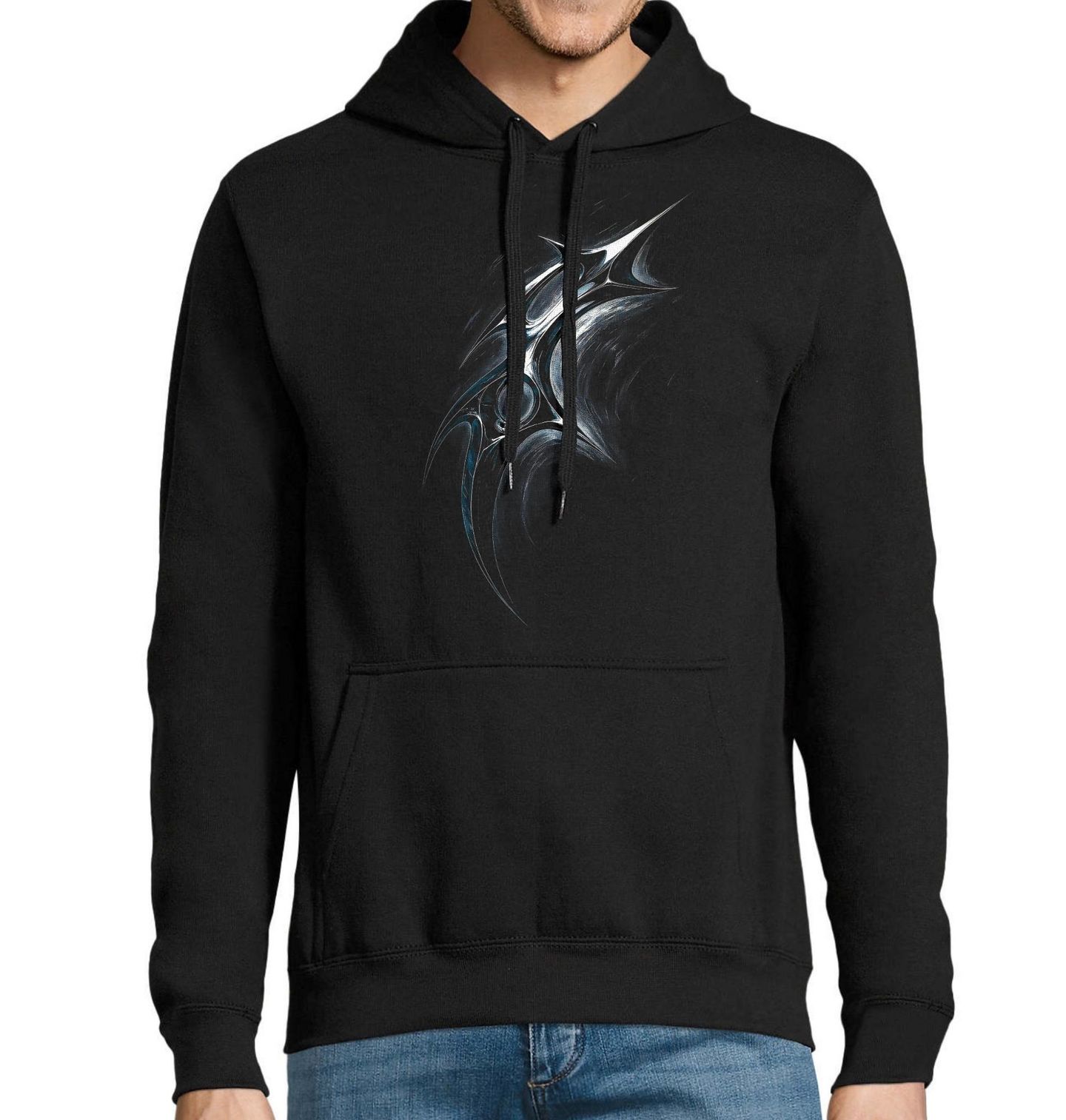 Pánská mikina Vrhací Čepel Tribal. Moderní a dynamický motiv inspirovaný tvarem, který připomíná ostrou čepel v tribal stylu. Abstraktní linie a futuristické křivky vytvářejí dojem pohybu, rychlosti a přesnosti. Tento design evokuje vrhací zbraň, která symbolizuje sílu, kontrolu a rozhodnost. Design připomíná energii, pohyb i skrytou sílu – typické prvky, které tribal styl reprezentuje. Temné tóny v kombinaci s kovovým leskem vytváří dojem hloubky a moderní estetiky.