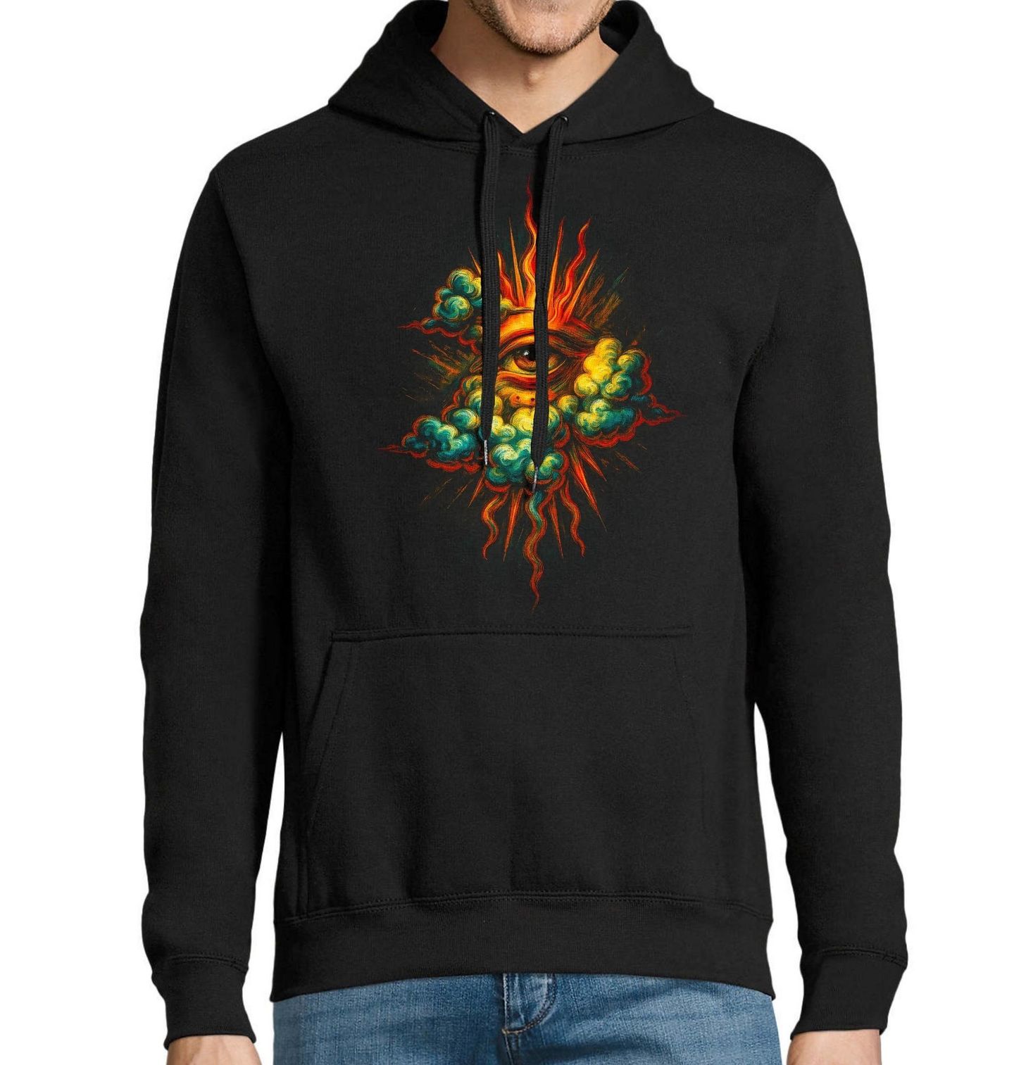 Pánská mikina Vševidoucí Oko mezi Mraky. Tajemství ukryté vysoko nad námi. Tento výrazný motiv zachycuje mystické oko obklopené dramatickými mraky, které symbolizují sílu, vědomí a skrytou energii. Kombinace ostrých barev a dynamických tvarů vytváří hypnotický efekt, který přitahuje pohled a nutí k zamyšlení. Design propojuje motiv oko jako symbol vnímání a poznání s prvkem mraky, které dodávají celku hloubku, pohyb a atmosféru tajemna.