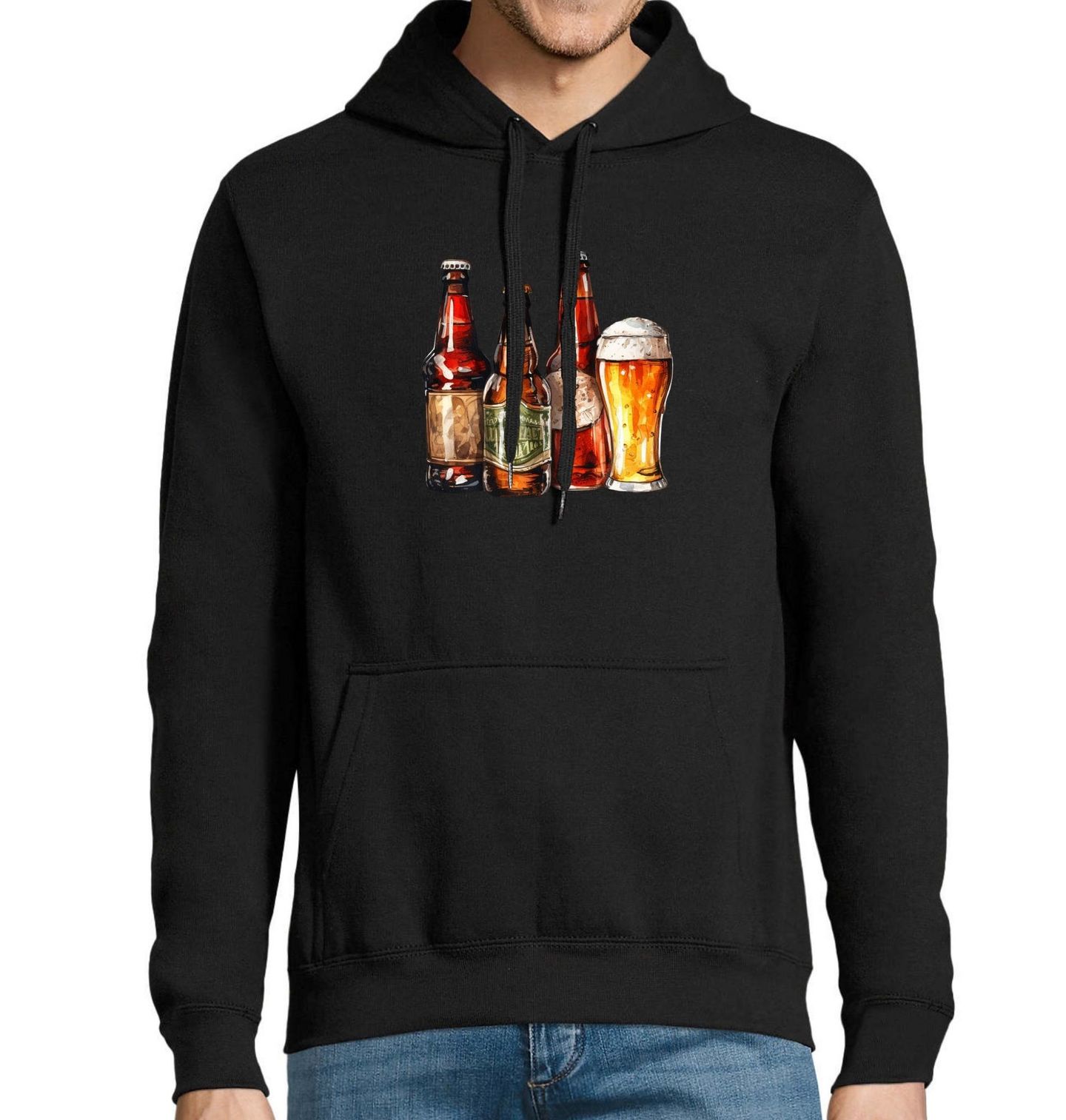Pánská mikina Vychlazené Pivo. Tento potisk zachycuje čtyři skvěle ilustrované láhve a sklenici, ve kterých se pivo prezentuje v celé své slávě – od pěny až po poslední kapku. Pokud je pro vás pivo víc než jen nápoj, je tohle design právě pro vás. Skvělý dárek pro každého, komu pivo dělá radost každý den.